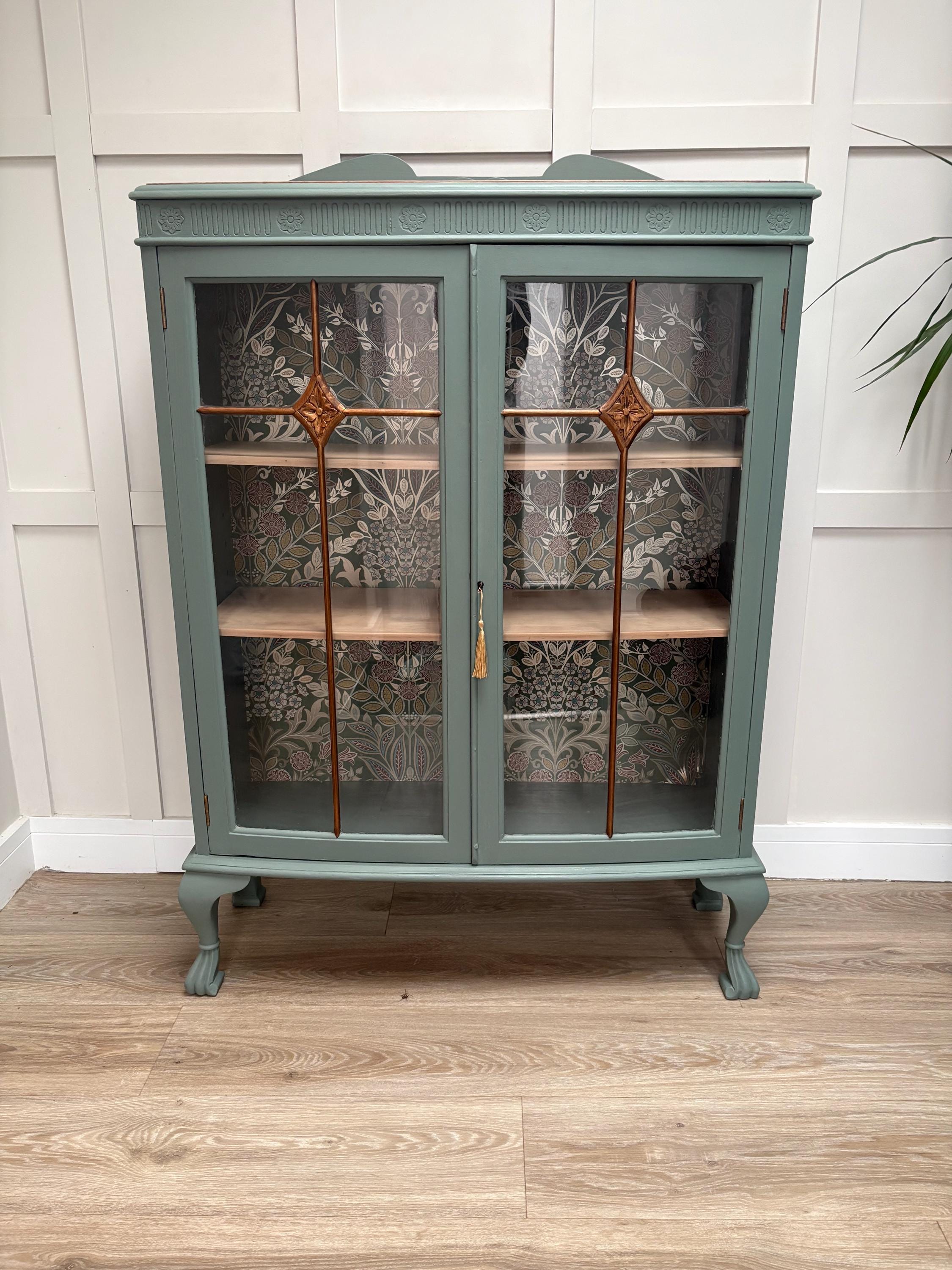 Painted in Frenchic steaming green, with contrasting wallpaper design, waxed finish with bronze trim...