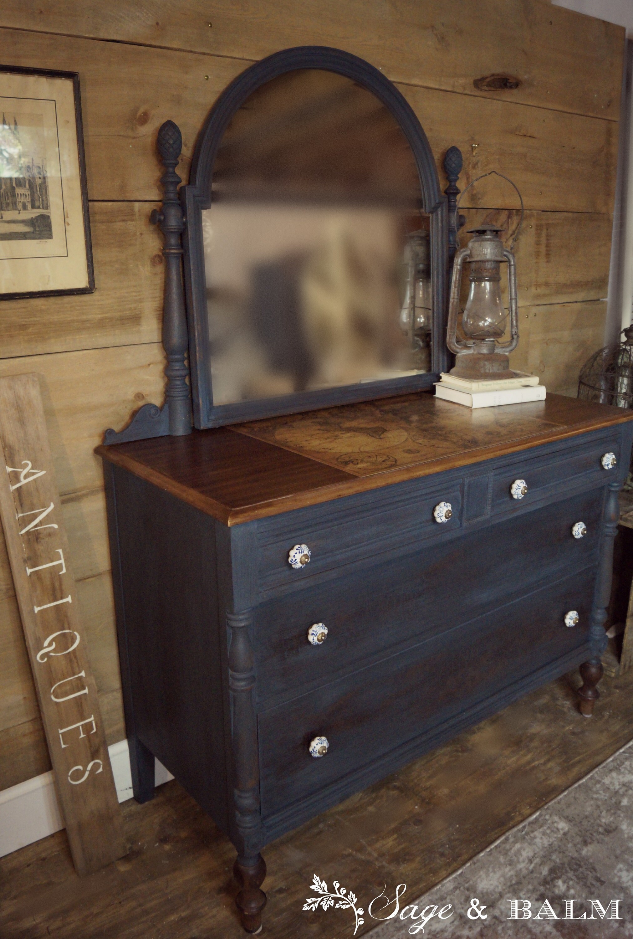 SOLD | Midnight blue vintage painted dresser with tilt mirror| milk...