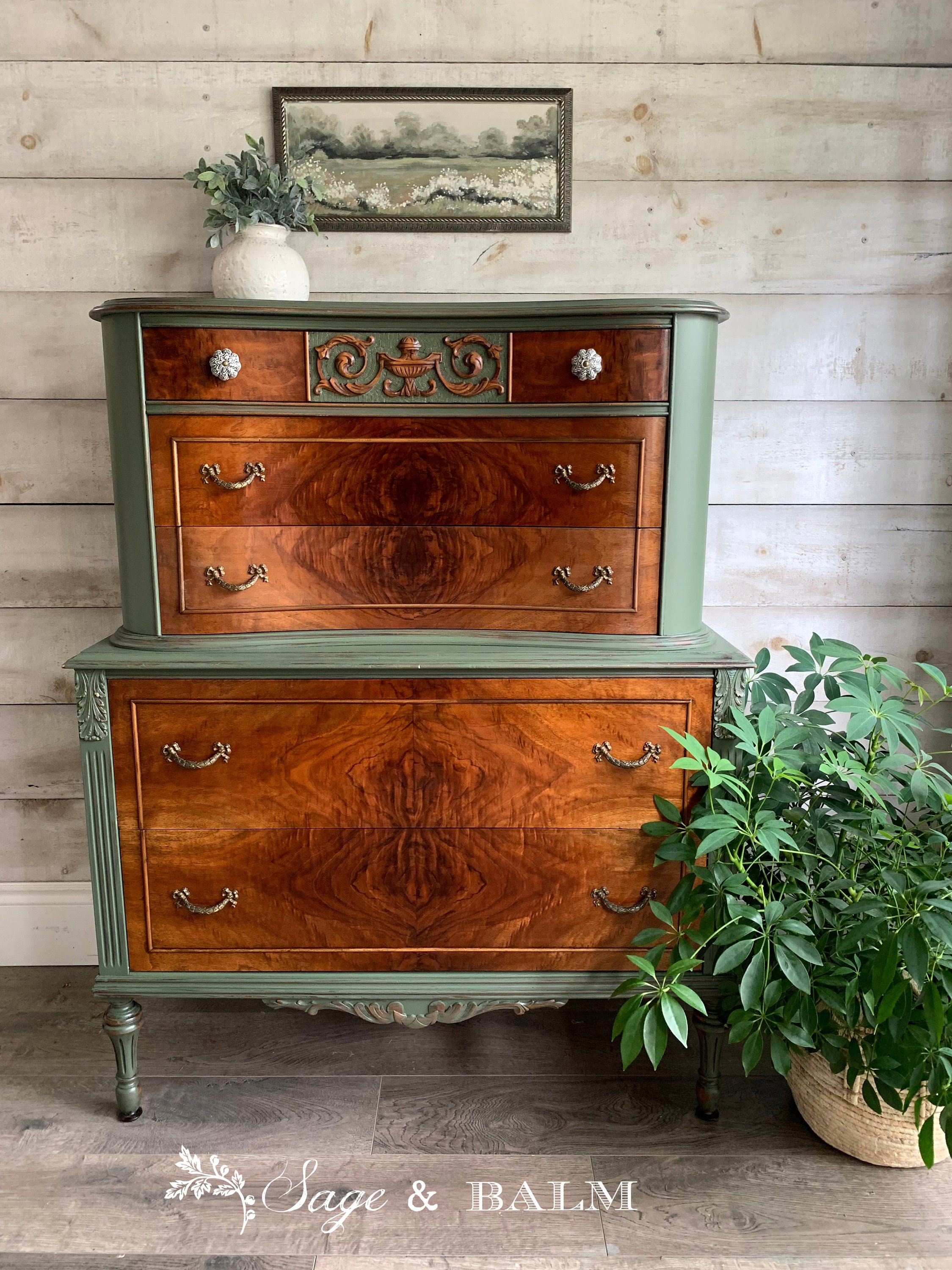 SOLD | Green & mahogany antique wood tallboy dresser | painted ...