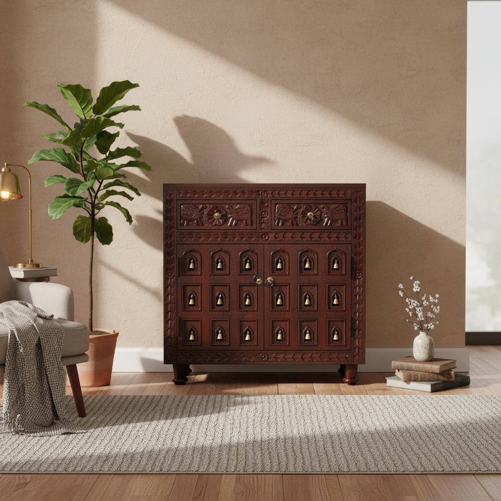 A dark polished wood finish. Two drawers at the top, intricately carved with animal motifs. A set of...