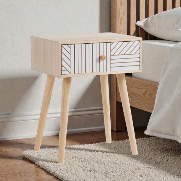 Scandi Pine Bedside Table with Carved Drawer and Wooden Legs
