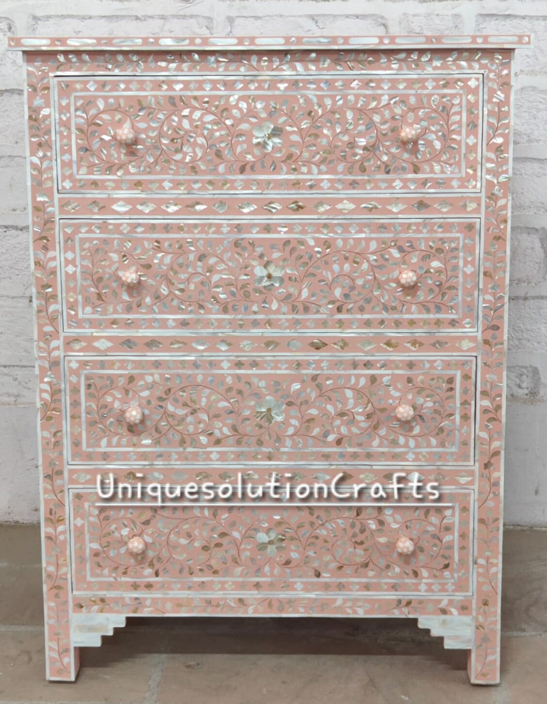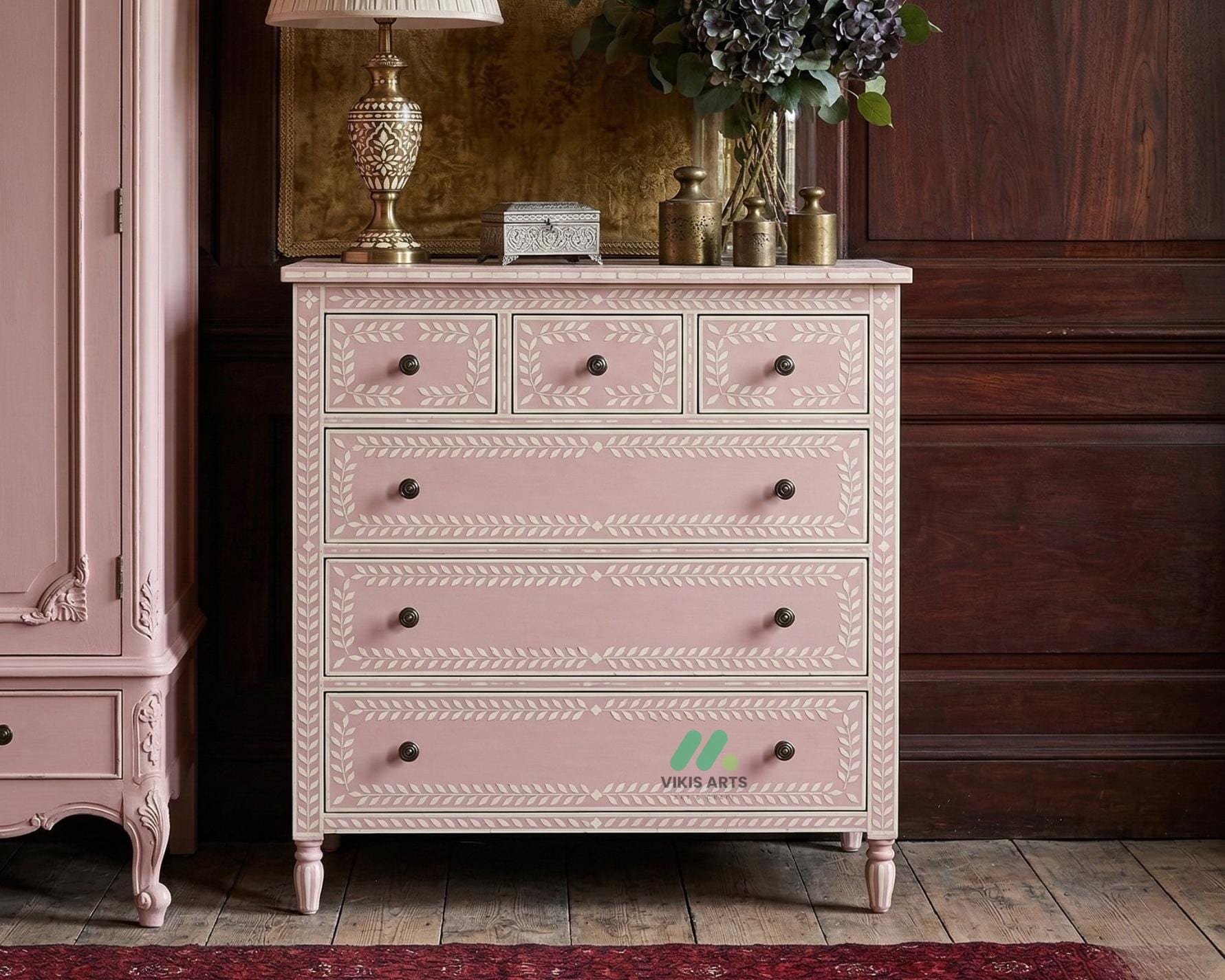Pink Bone Inlay 6 Drawer Chest: Handcrafted Wood Dresser for Bedroo...
