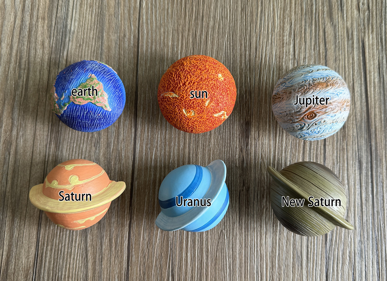 earth: 4.3*4.3cm sun:5cm*5cm Jupiter:4.5*4.5cm Saturn:4.6*6.3cm Uranus:4.6*6.3cm New Saturn:4.6*6.3c...
