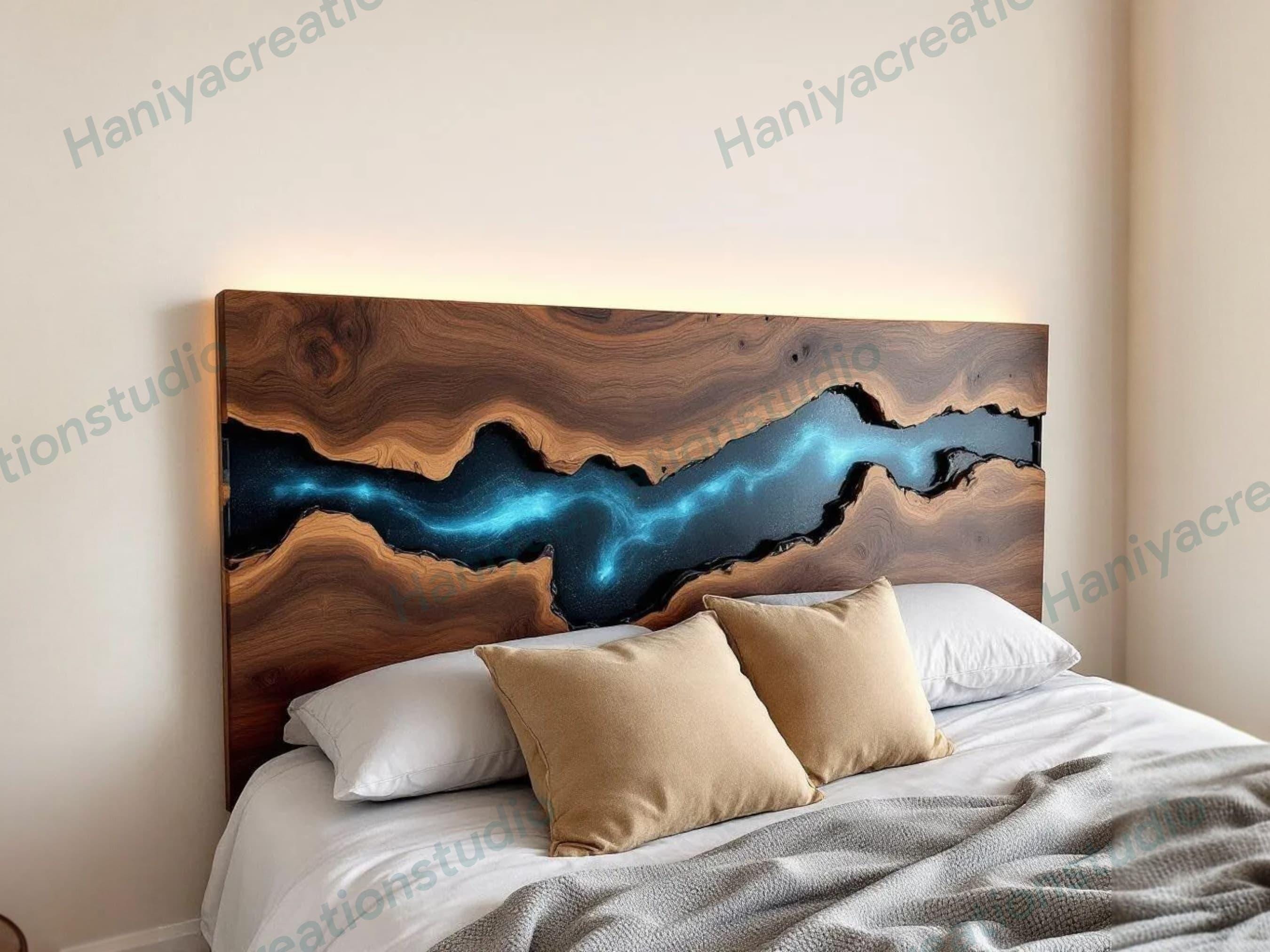 King Size Epoxy Resin Ocean Waves Wood Bed Headboard: Modern Rustic