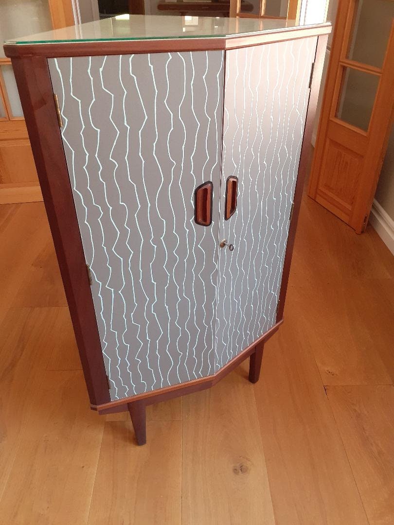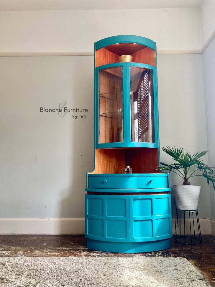Mid Century Modern corner drinks cabinet by Nathan, professionally hand painted in a stunning Turquo...