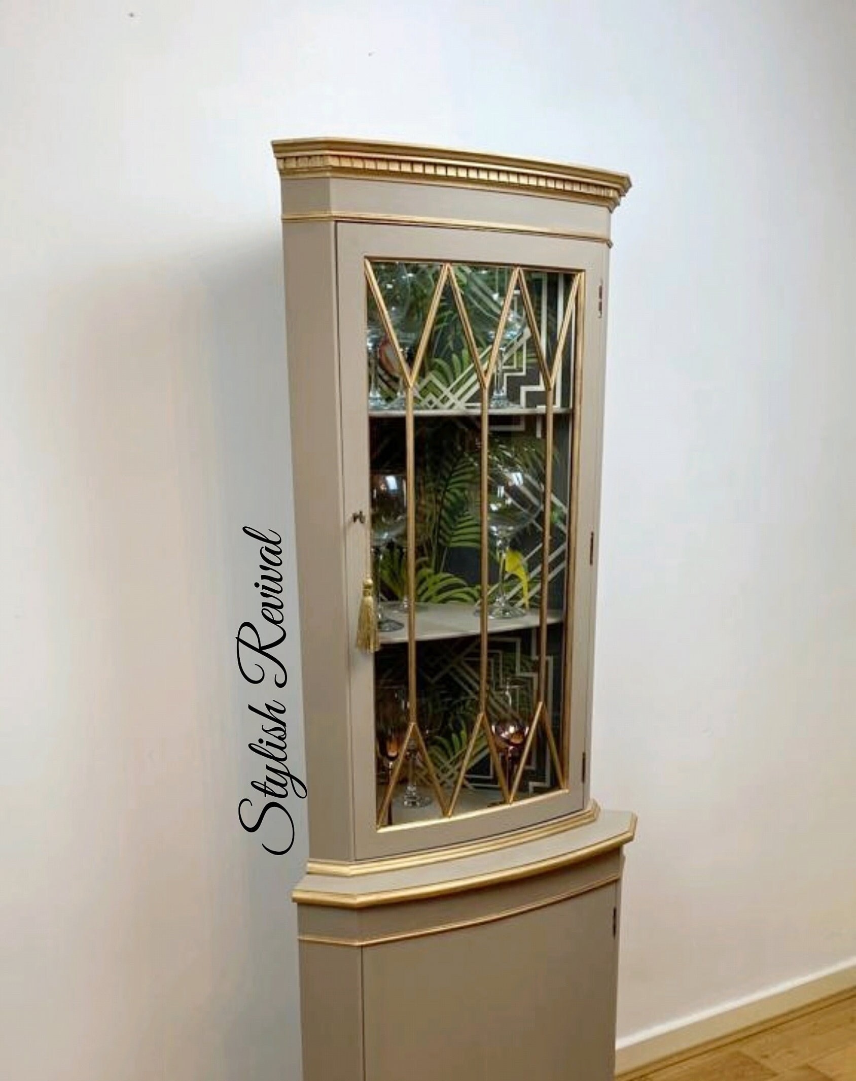 Drinks display corner china cabinet beige taupe spray painted art deco vintage Stylish Revival Profe...