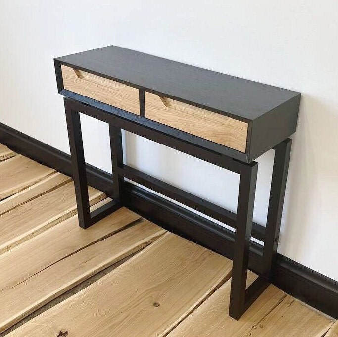 The narrow modern black console with drawers is a versatile piece of handmade furniture designed to ...