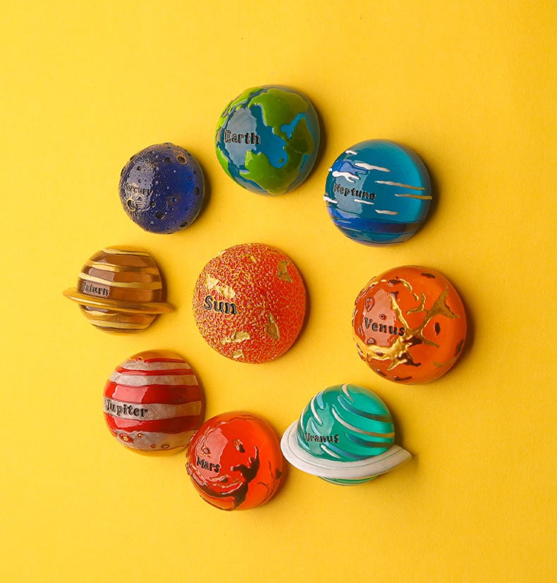 Jupiter:4.4*4.4cm moon:4*4cm Meteorite:4*3.5cm earth: 4.6*4.6cm alien:4*5cm Mars:4.4*4.4cm Neptune:4...