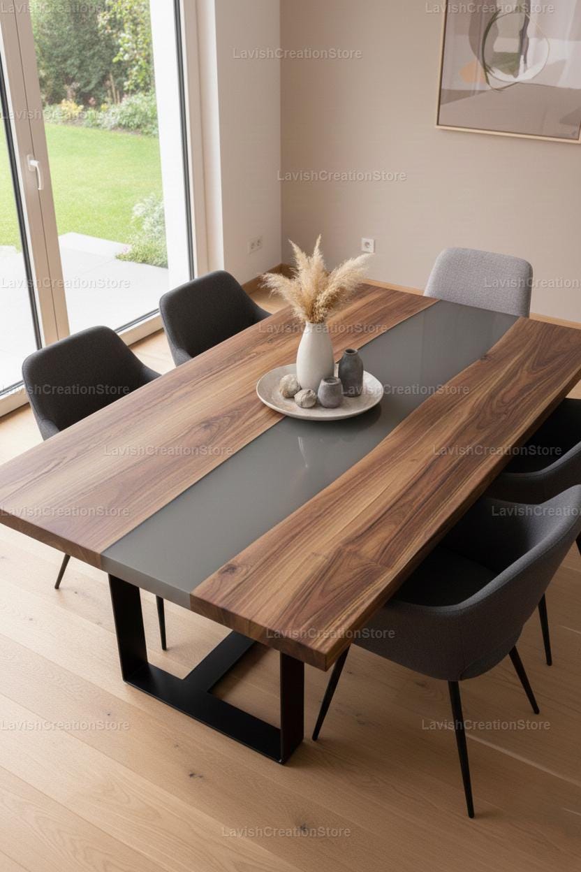 • Handcrafted Walnut Dining Table | Smoked Glass Center, Modern Desig...