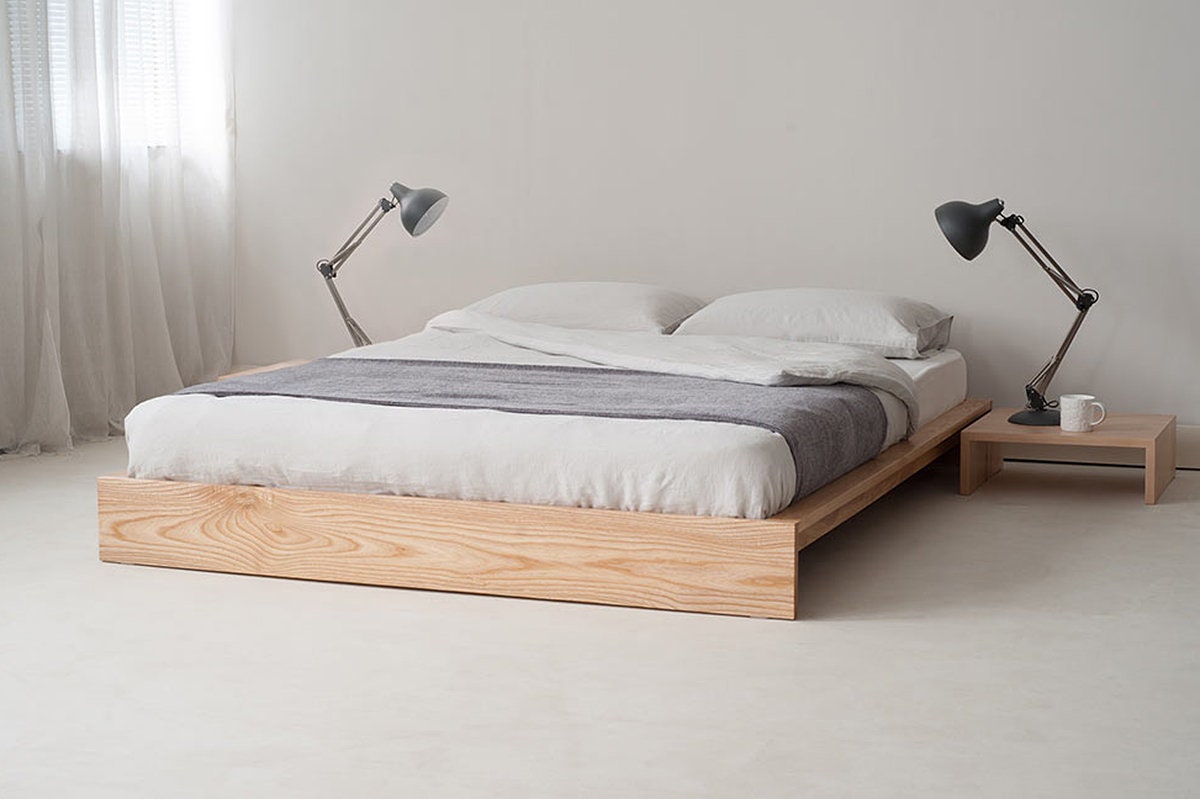 Japanese Style Floating Bed Frame, Minimalist Hardwood Oak Slab