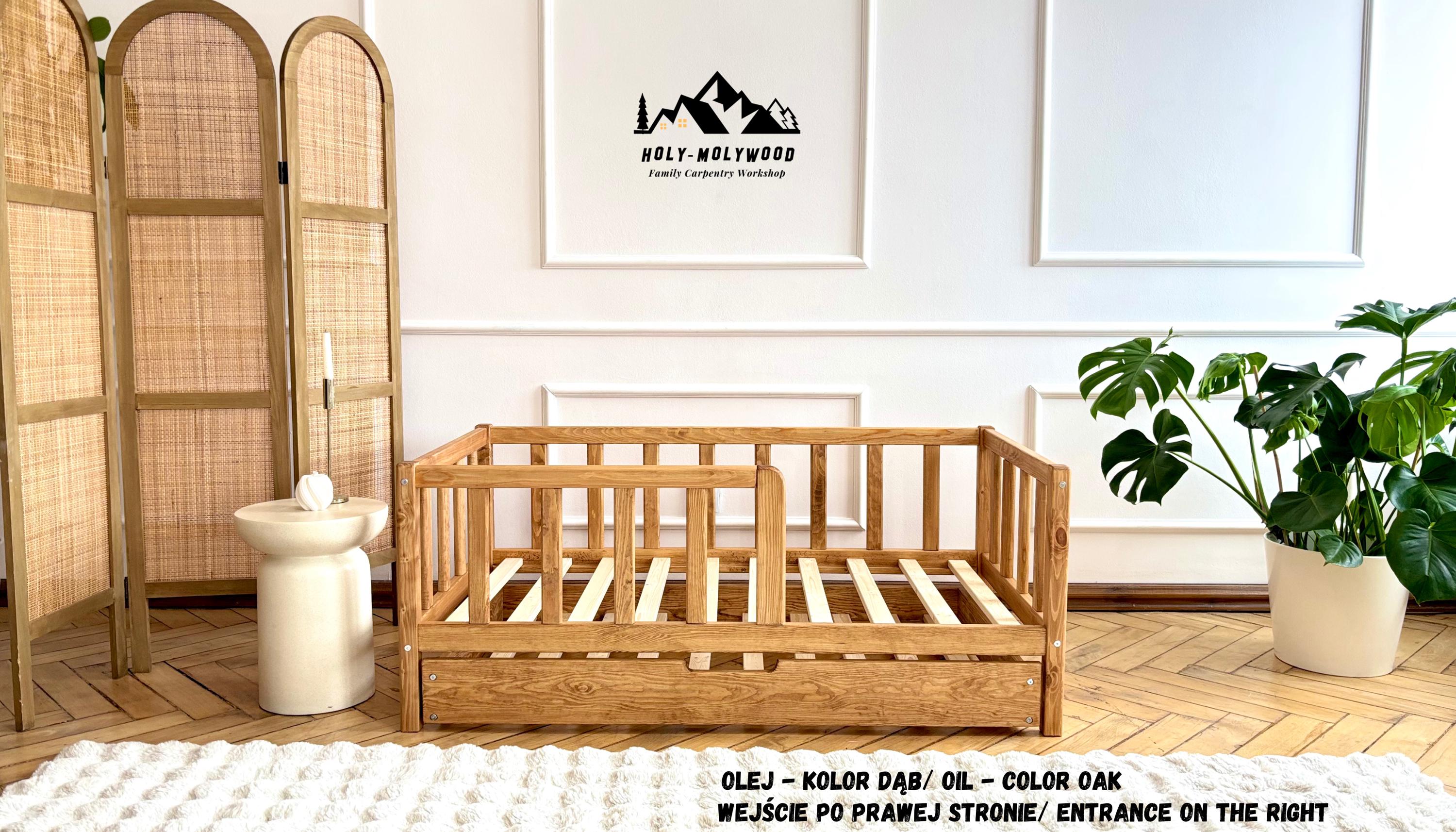 Montessori Floor solid wood Bed with Rails & Pull-Out Shelf: To...