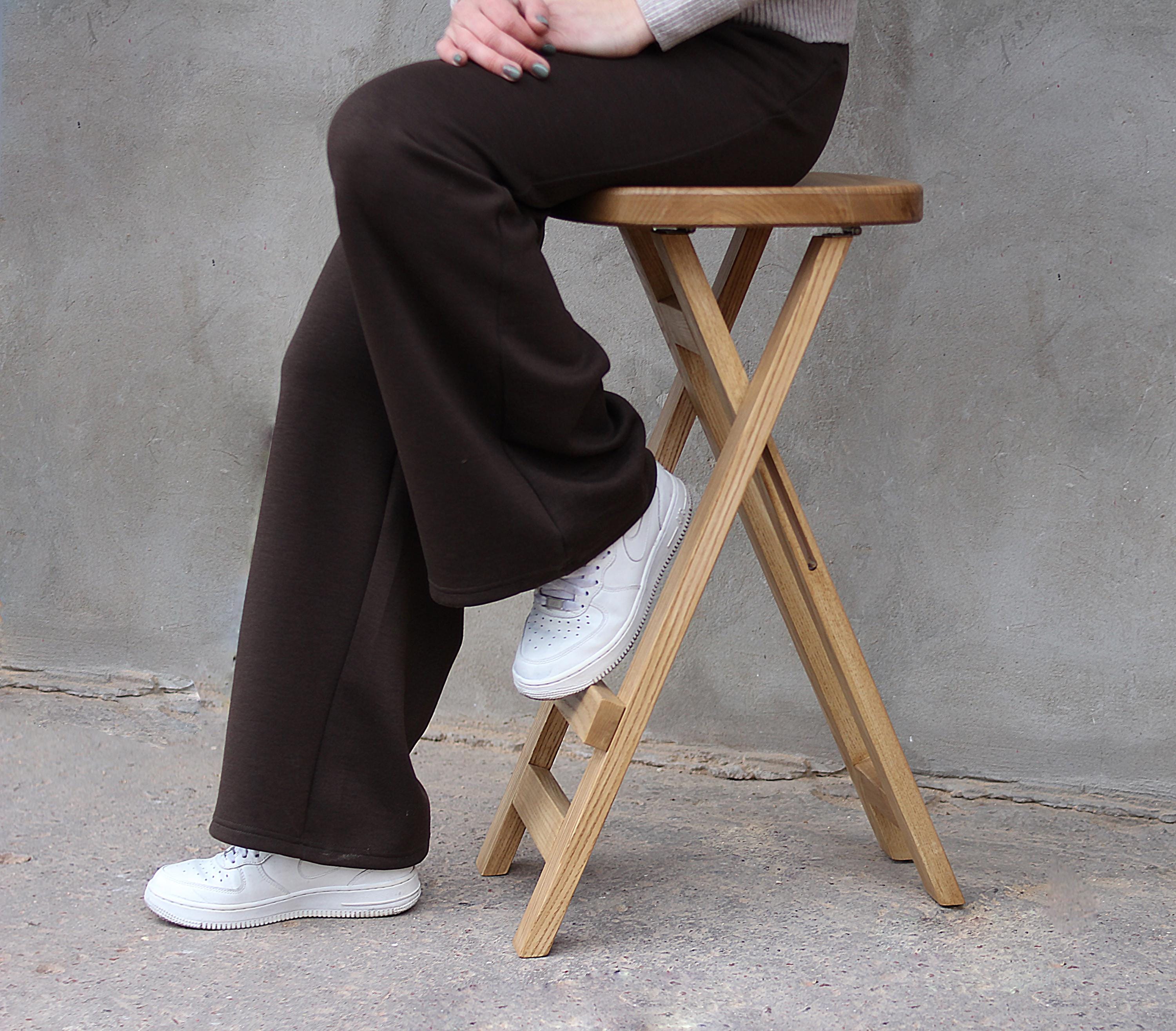 "This beige solid wooden folding stool is a versatile and stylish seating solution for any spac...