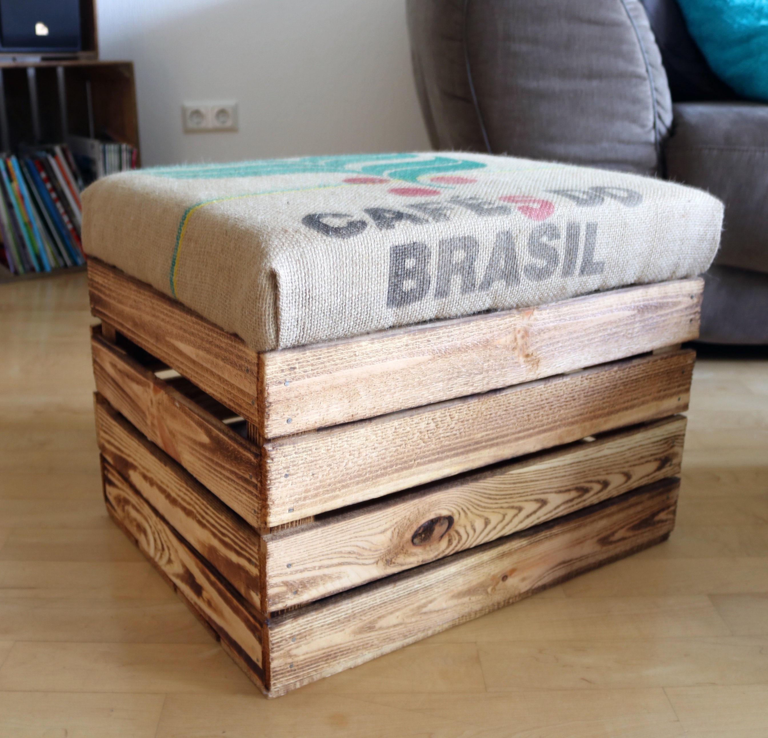 SEAT STOOL made from FRUIT CRATES with original COFFEE SACK COVER r...