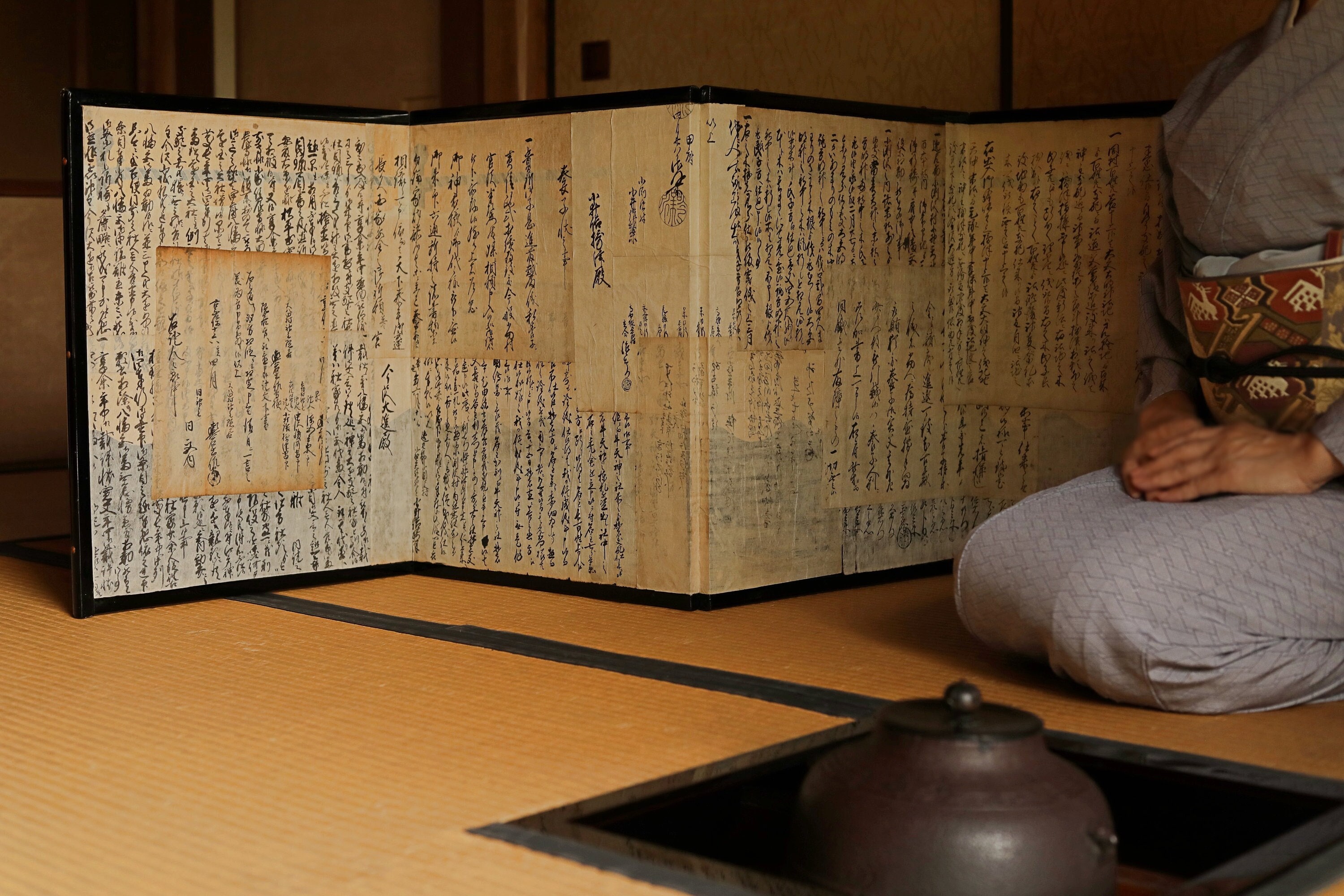 "Japanese old low foldable screen \"byobu\" covered with kanji calligraphy papers col...