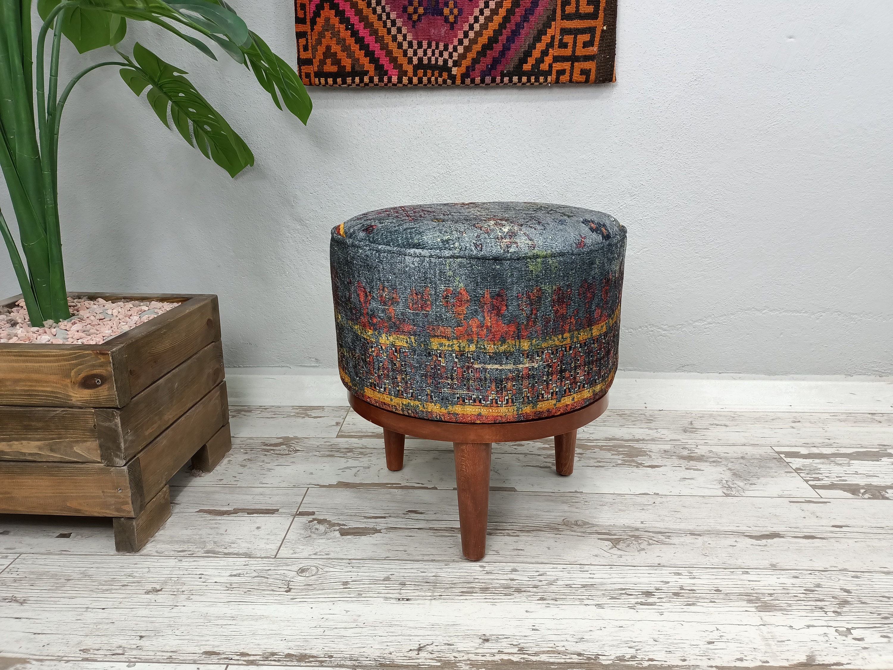 "Colorful Kilim Makeup Stool - Round Vanity Ottoman Pouf with Wood Legs - Small Boho Footstool ...