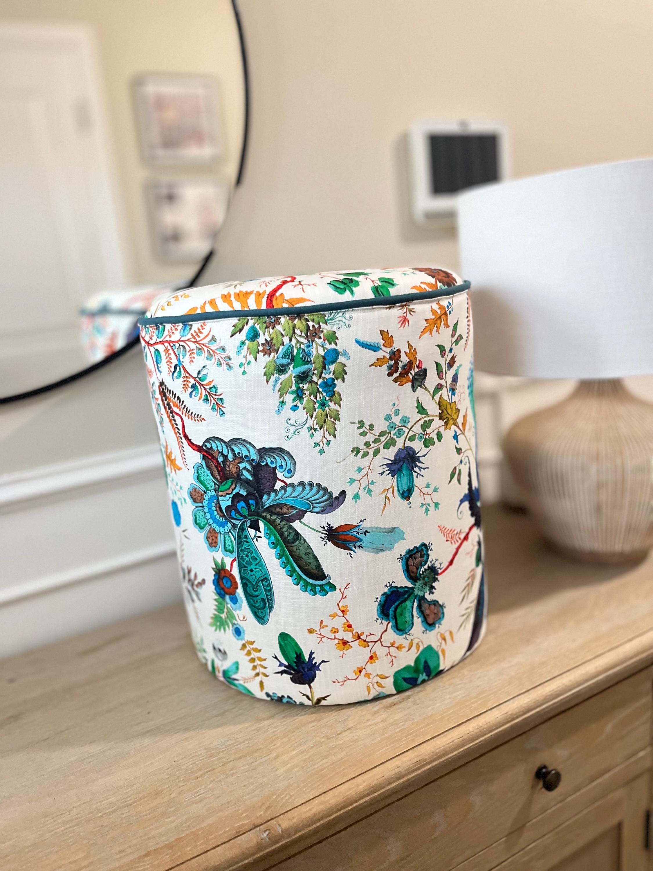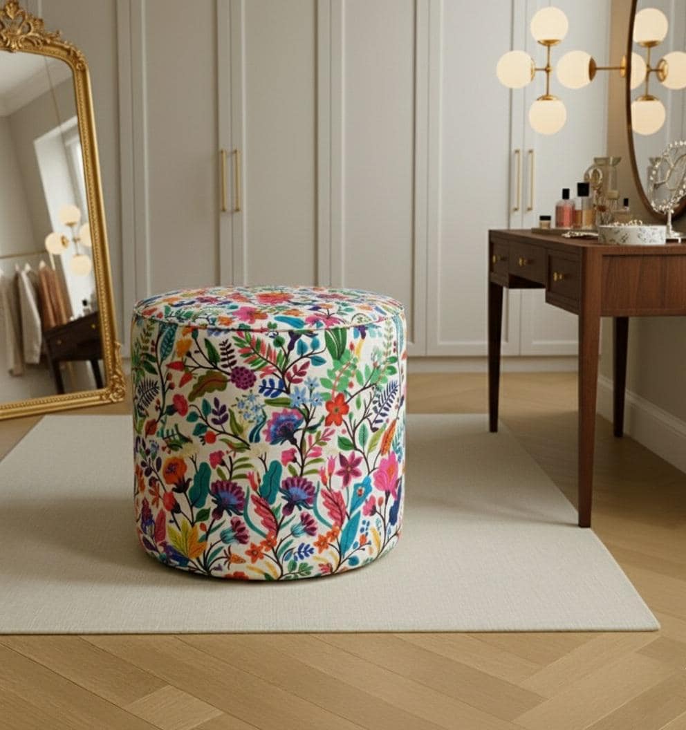Colorful Floral Round Ottoman - Handmade Cylinder Pouf, Vanity Stoo...