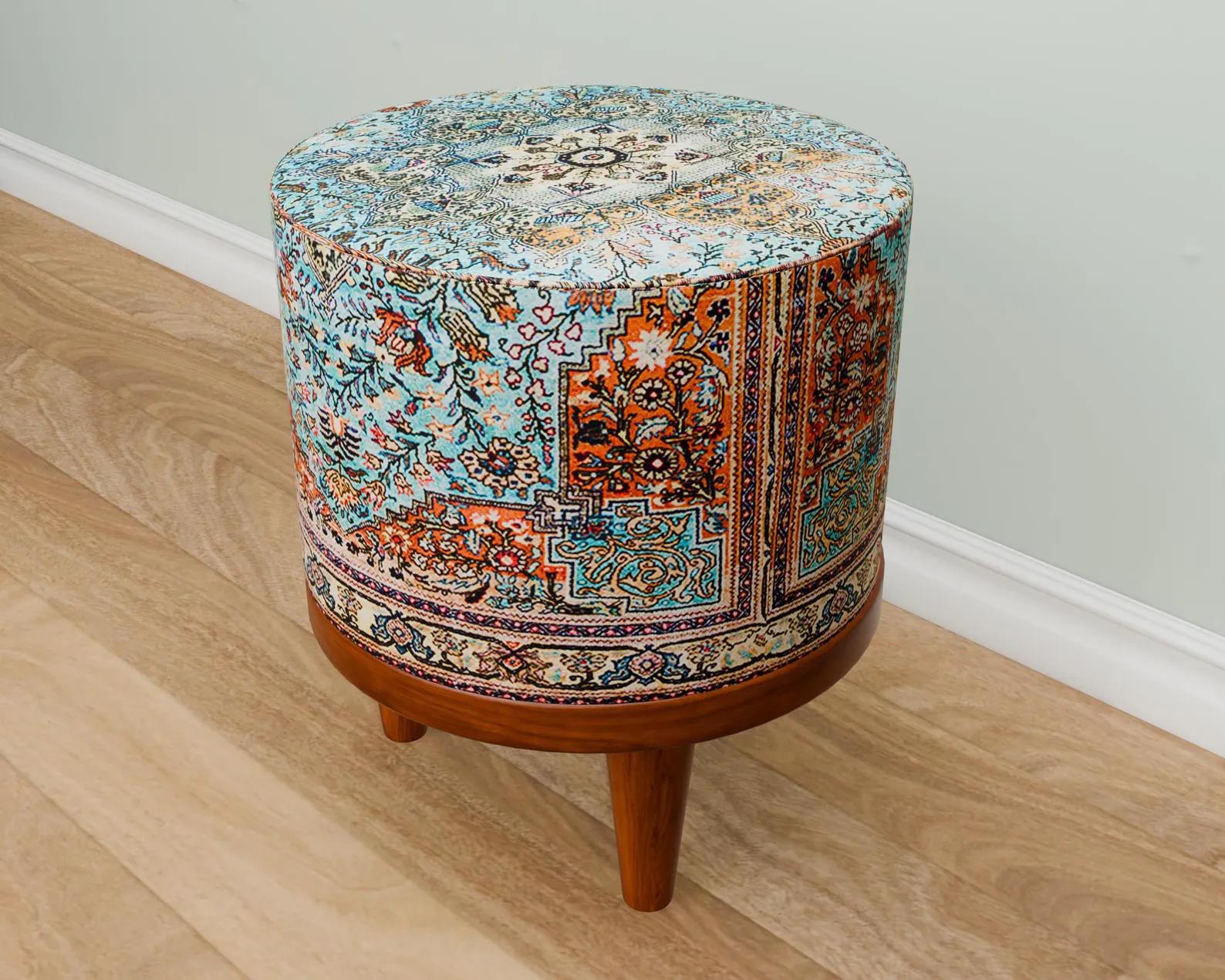 Colorful Kilim Makeup Stool - Round Vanity Ottoman Pouf with Wood L...
