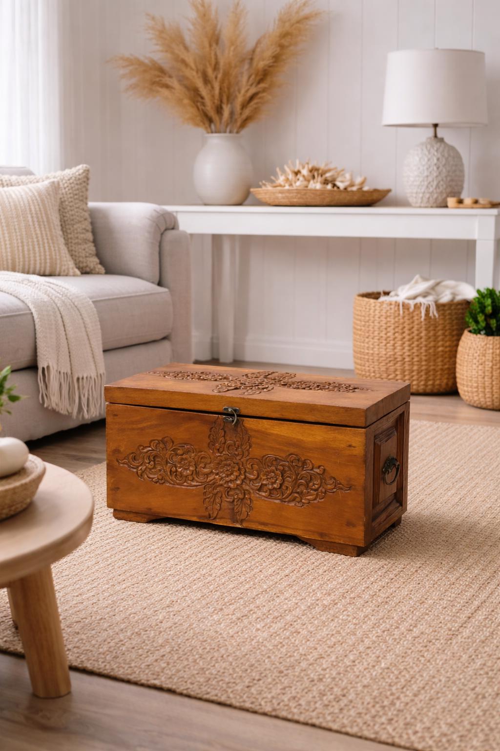 Travellers Finds brings you a beautifully handcrafted chest with latch. Wooden hand carved with 2 ca...