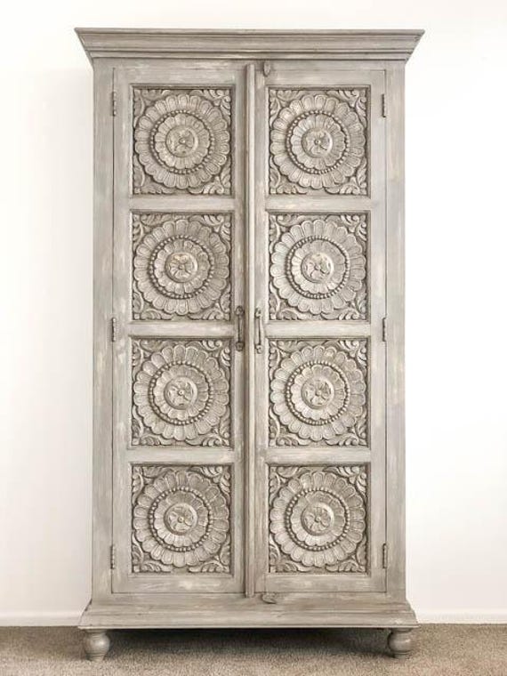 Hand Carved Mango Wood Almirah | Floral Carved Cabinet | Indian Vin...