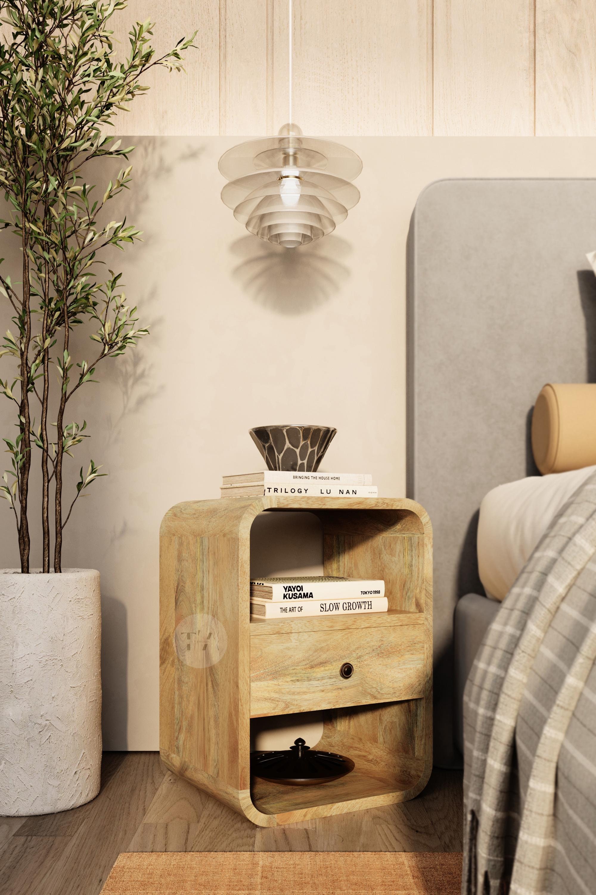 Our curved natural mango wood bedside table with storage drawers and shelves is the ideal addition f...