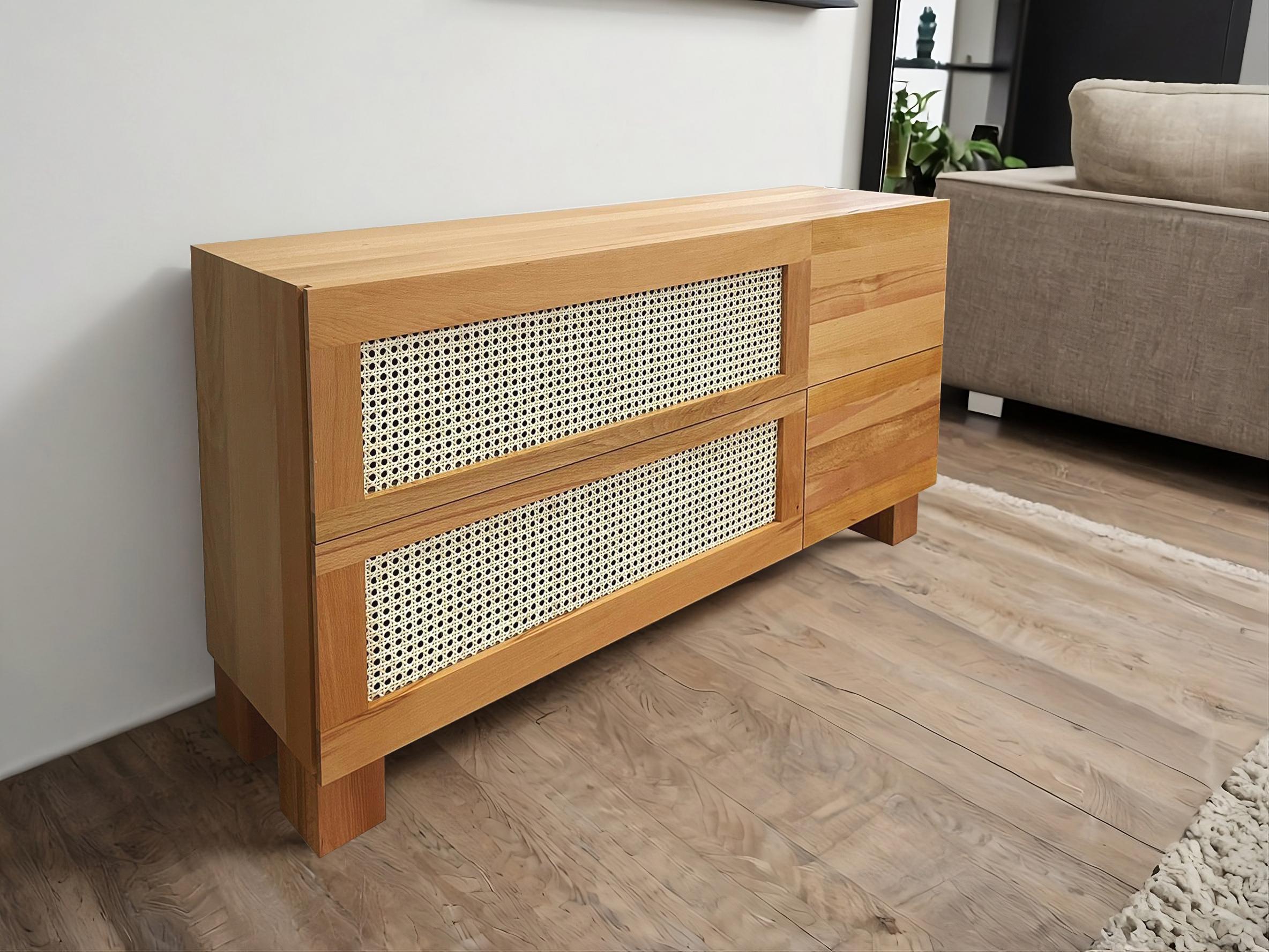 "Solid beech wood sideboard with natural rattan doors. Modern, handmade design for use as a nig...