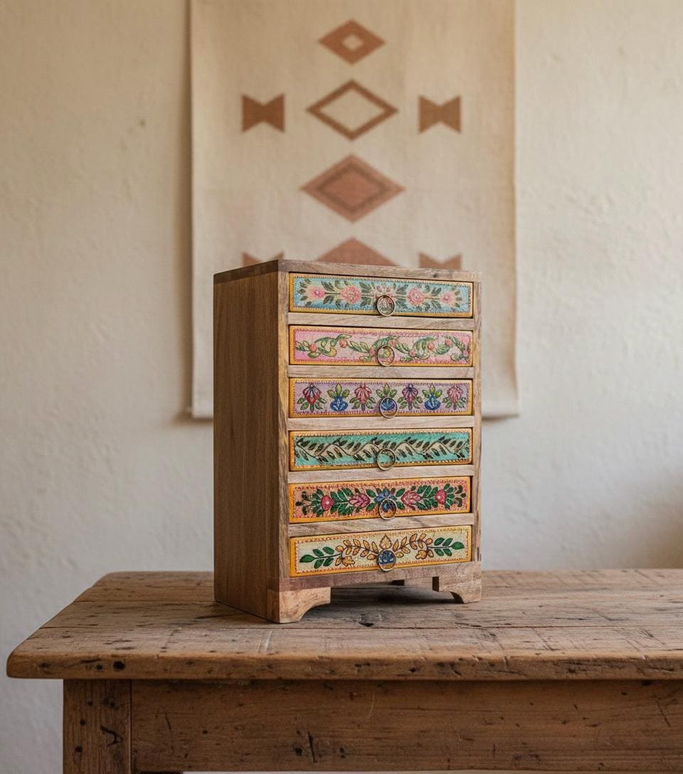 A gorgeous, hand painted, wooden mini drawer chest handcrafted from sustainable mango wood. This 6 d...