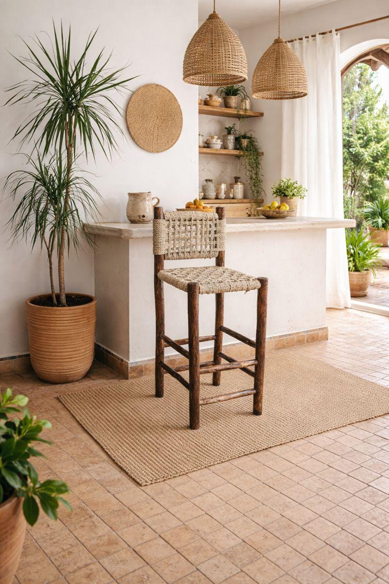 Moroccan Handwoven Bar Stool with Palm Leaf Cord - Handmade Wooden ...