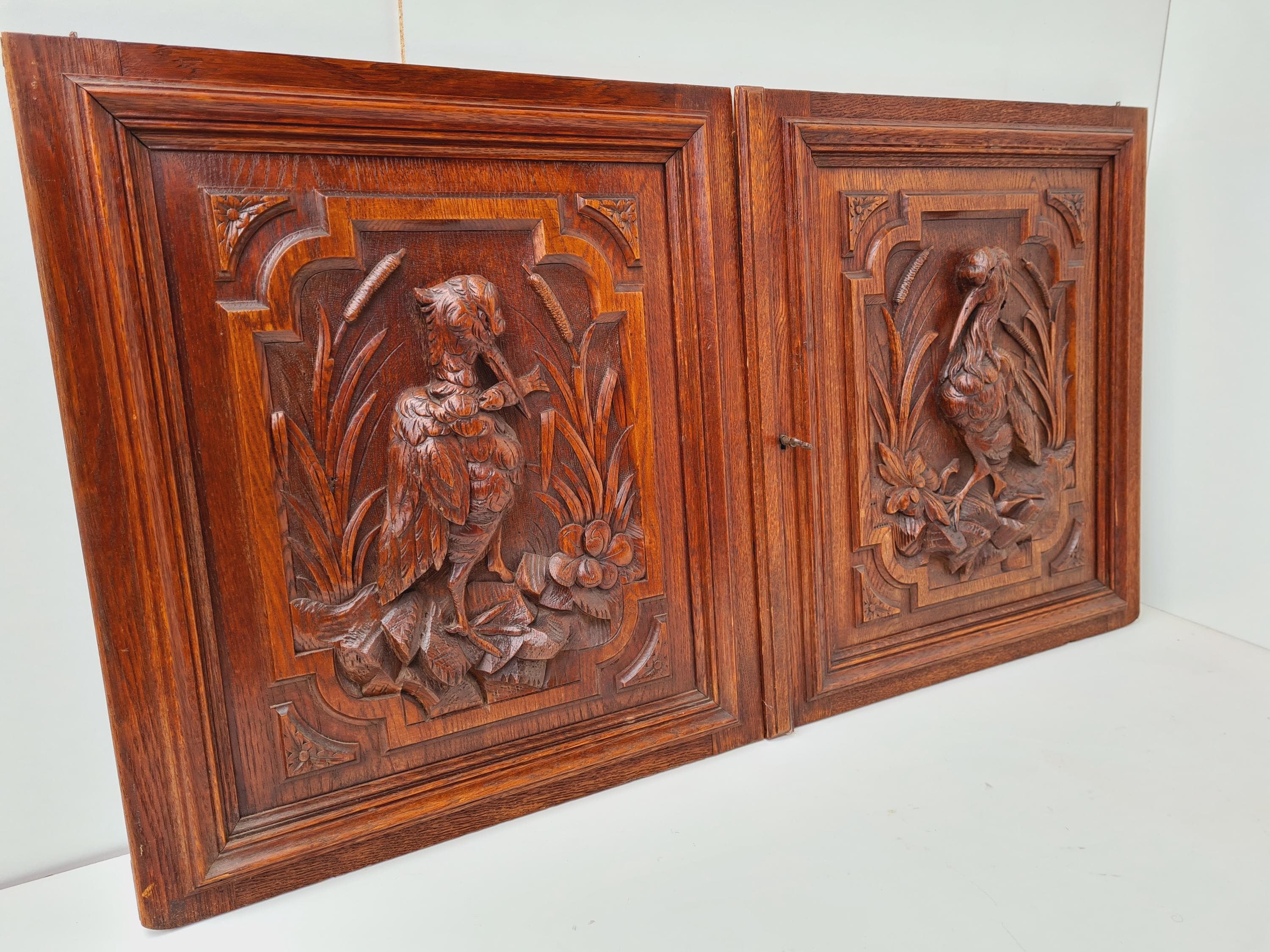 French pair oak wooden wardrobe or cupboard door panels with a bird...