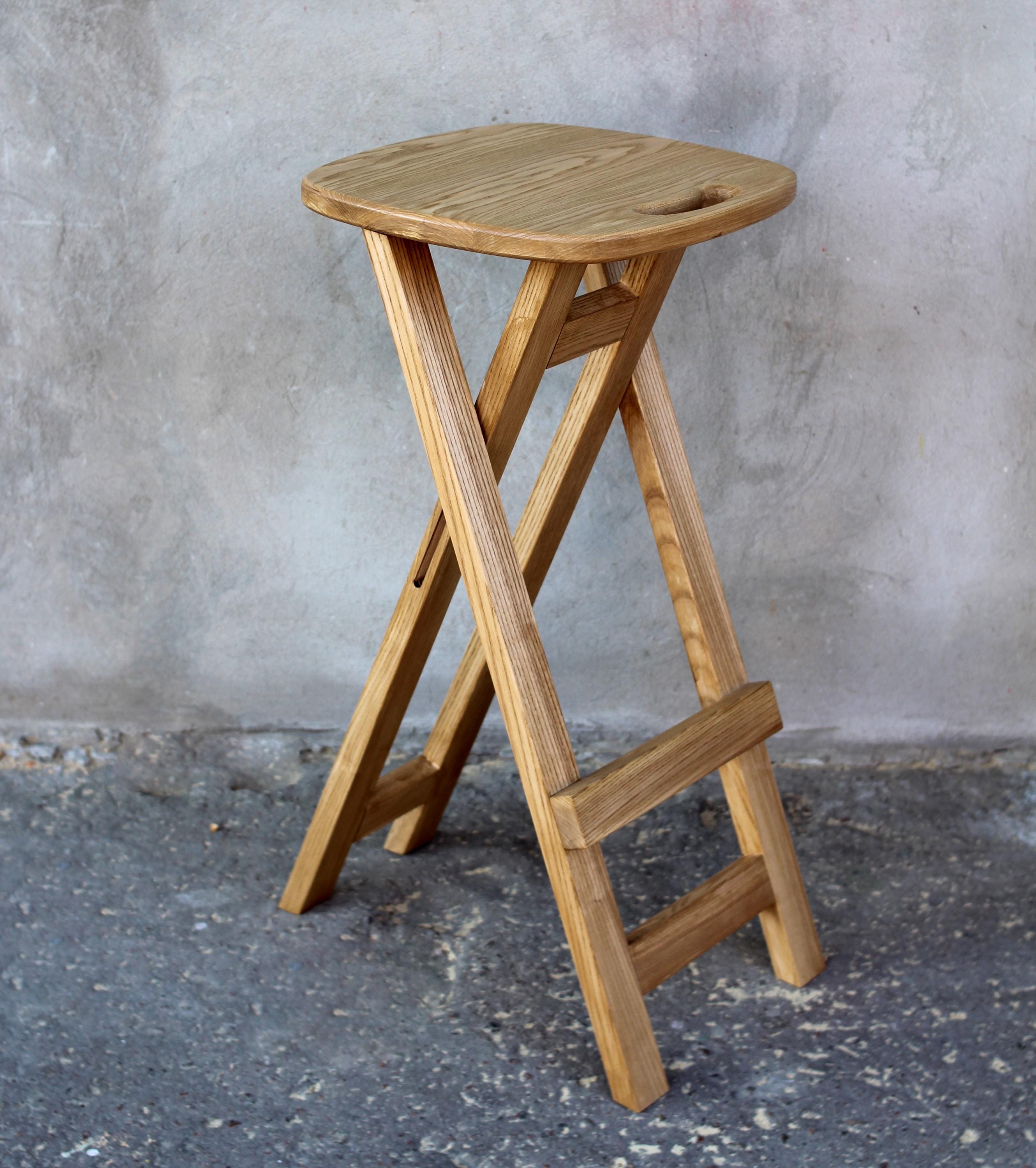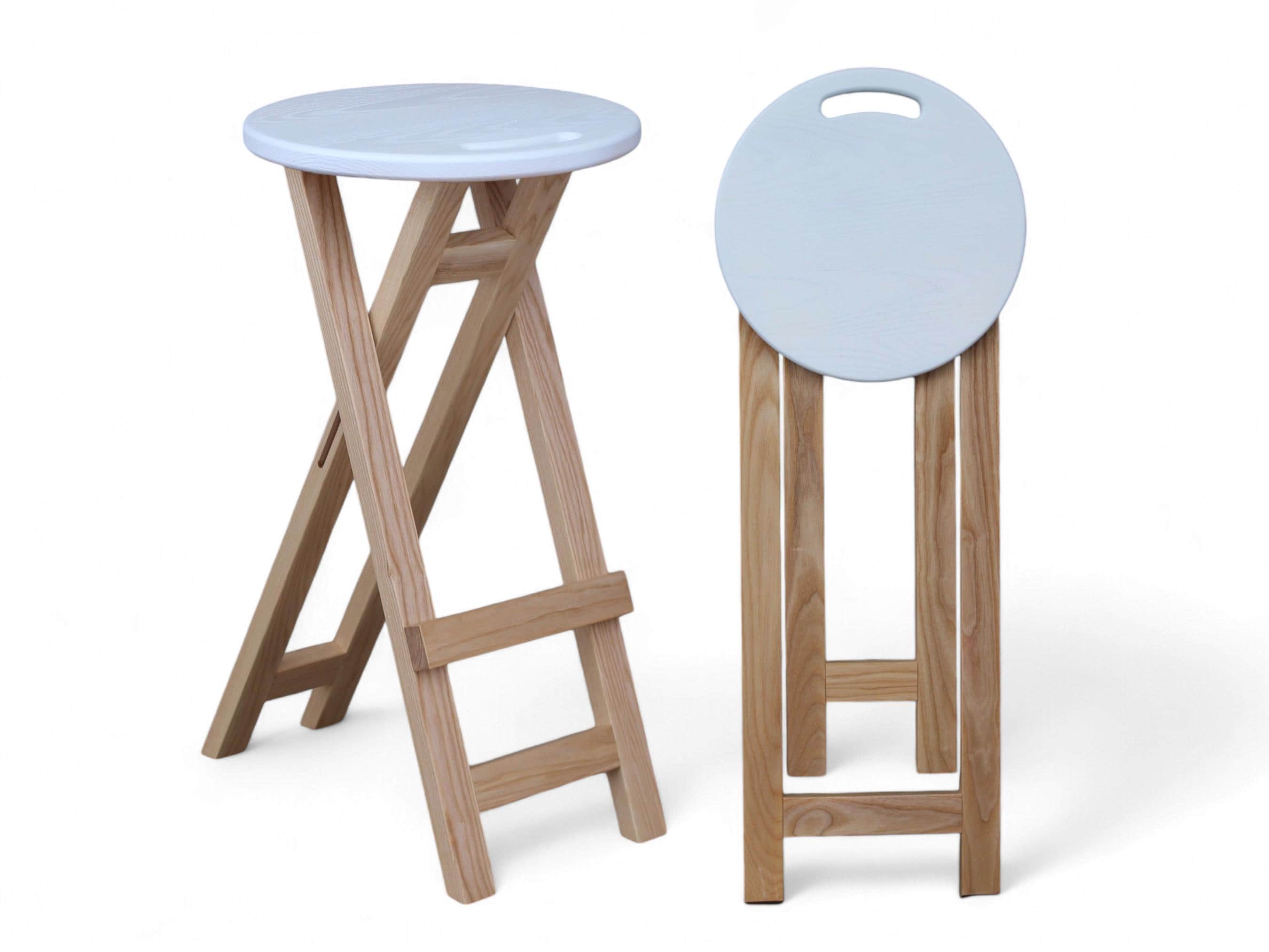 Solid Wooden Folding Stool with Circular White Seat Foldable Handle...
