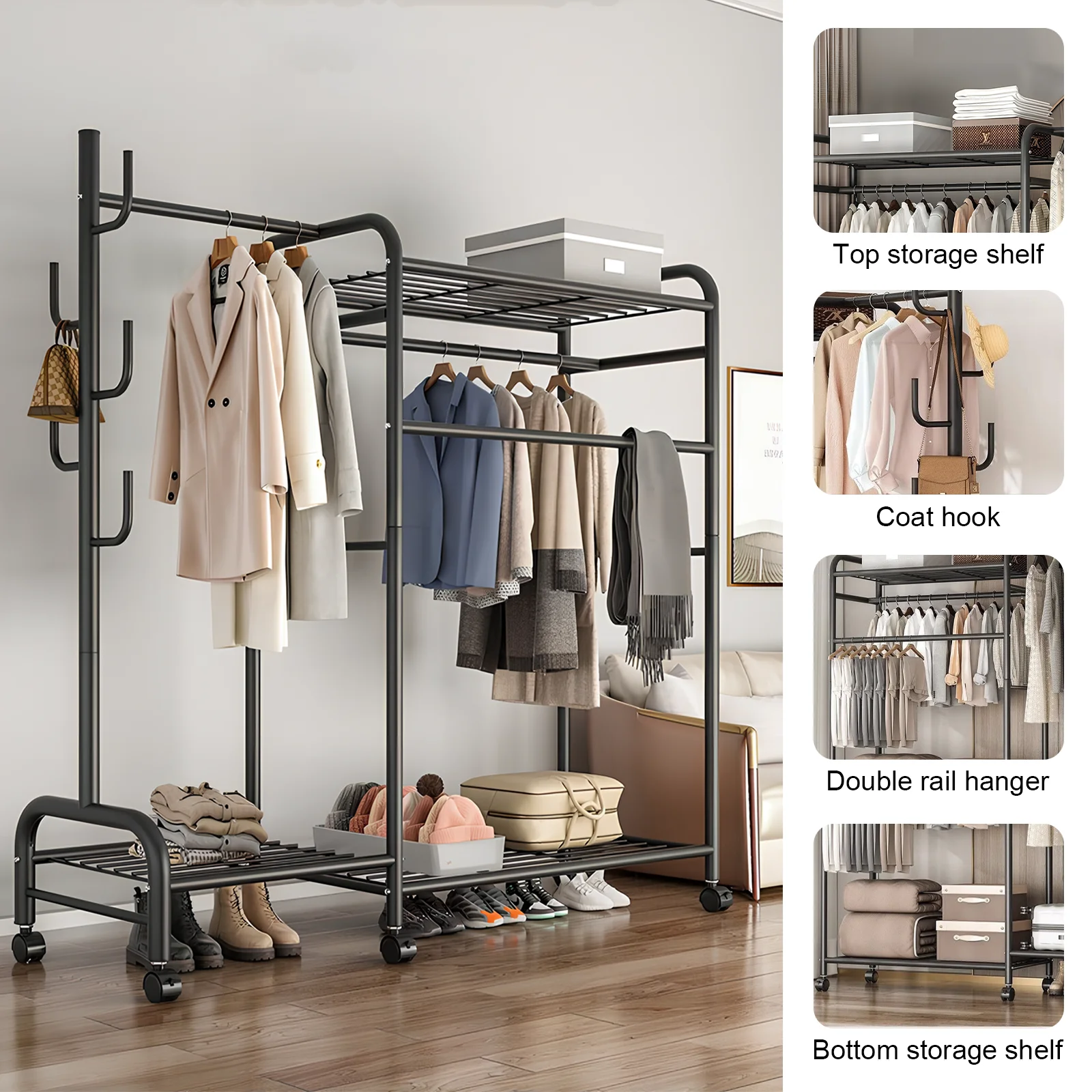 Clothes Rack Movable Multi-Rail Clothes Shelf Easy To Install Coat ...