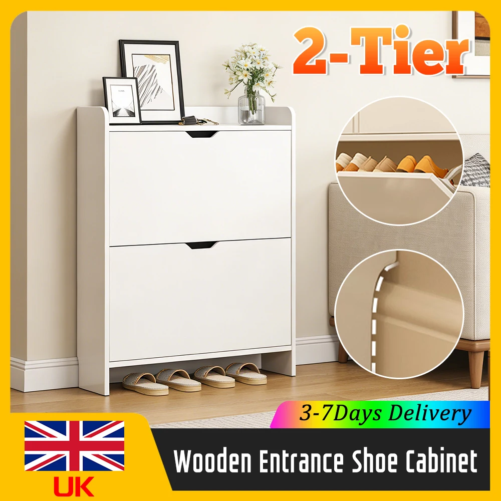 2-Tier Wooden Entrance Shoe Cabinet Flip Drawers Narrow Shoe Storag...