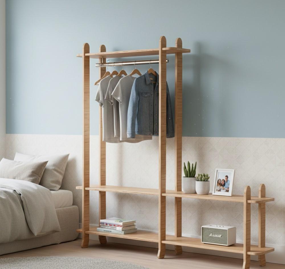 Minimalist Birch Wood Wardrobe: Modern Open Shelving Unit