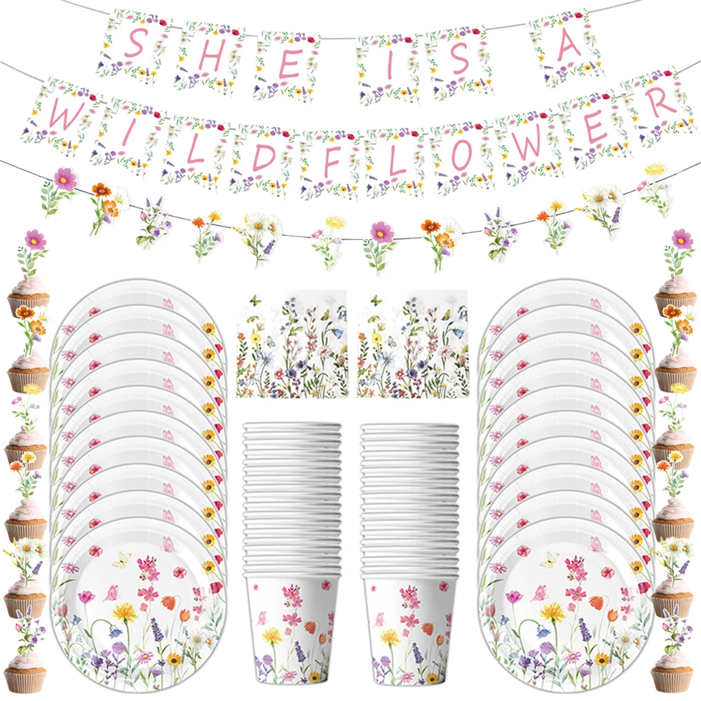 Spring Wildflower Pattern Disposable Tableware Plates Cups Napkins Girls Flower Birthday Party Baby ...