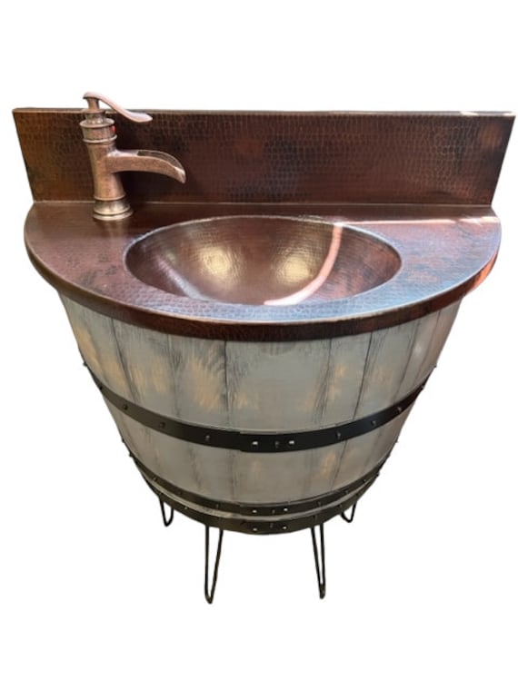 Rustic Half Wine Barrel Bathroom Sink Vanity with Hammered Copper S...