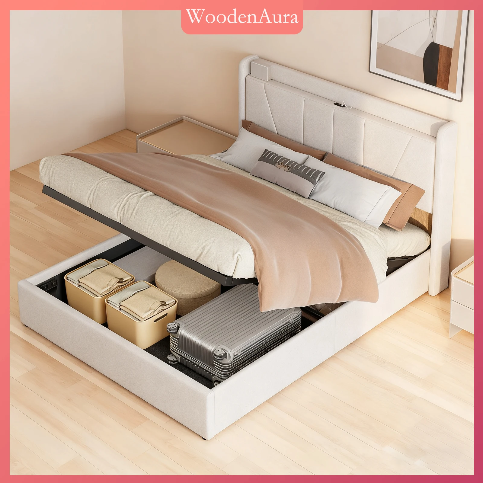 Double padded bed, 160x200 cm, bed headboard, with C USB socket, charging function, storage chest, b...