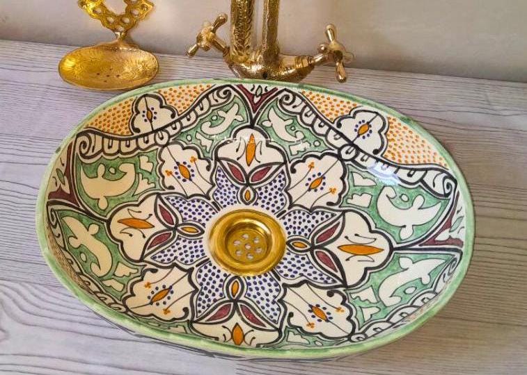 "Immerse yourself in the artistry of Morocco with this one-of-a-kind, hand-painted ceramic sink...
