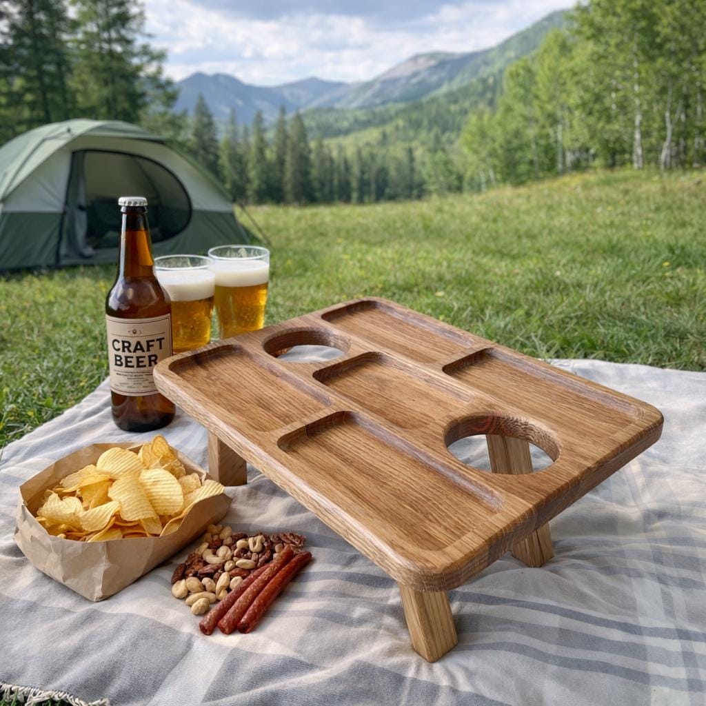 Wooden Beer Snack Table - Foldable Oak Beer Table with Snack Compartments - Picnic Beer Table with B...
