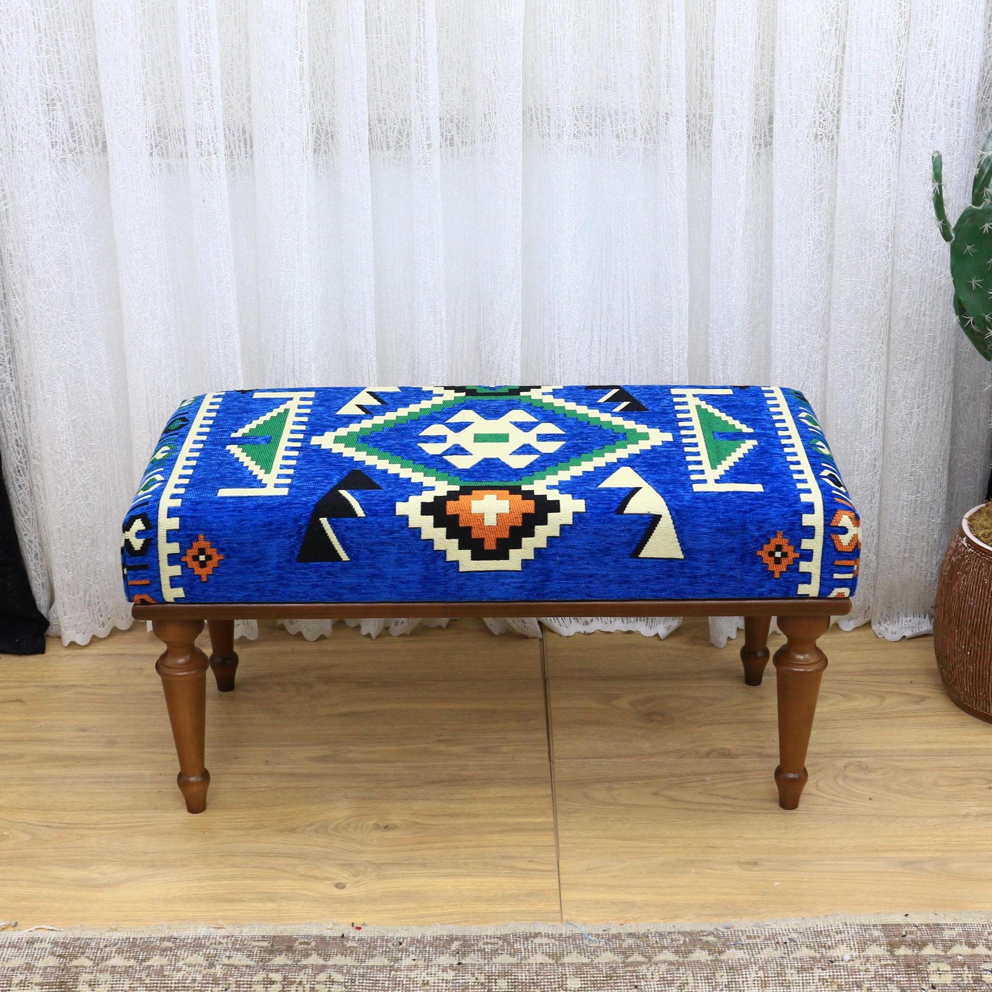 Blue Kilim Bench Upholstered with Handmade Turkish Rug Cover, Boho ...