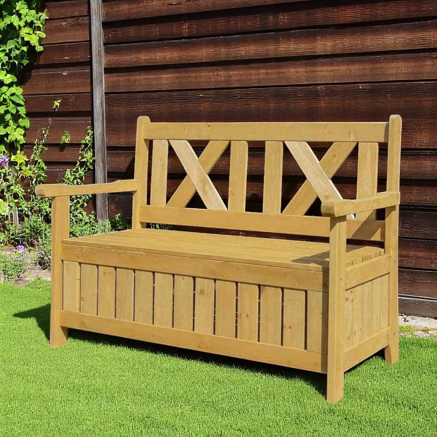 2 Seater Outdoor Garden Bench with Built In Storage Treated Fir Wood Natural Warm Wood Effect Combin...