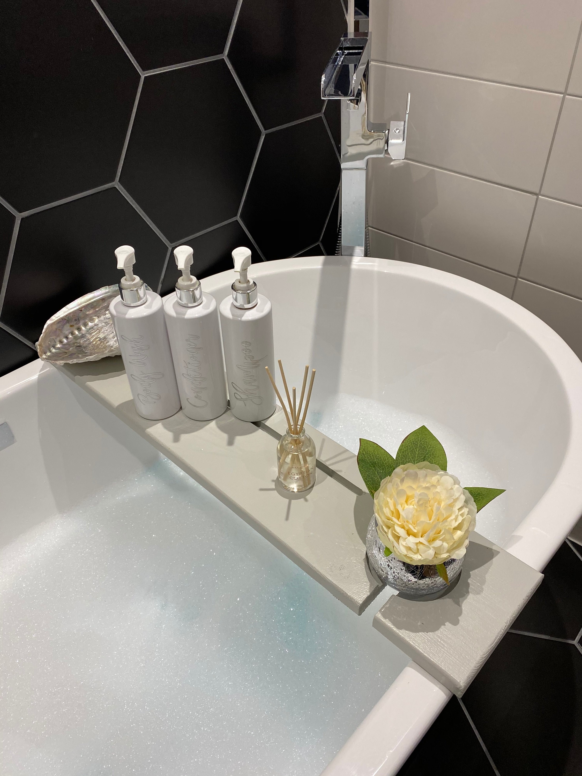 Handmade in the UK Bath board 70cm wide. 2 tea light holders Wine / Gin glass holder (can also be us...