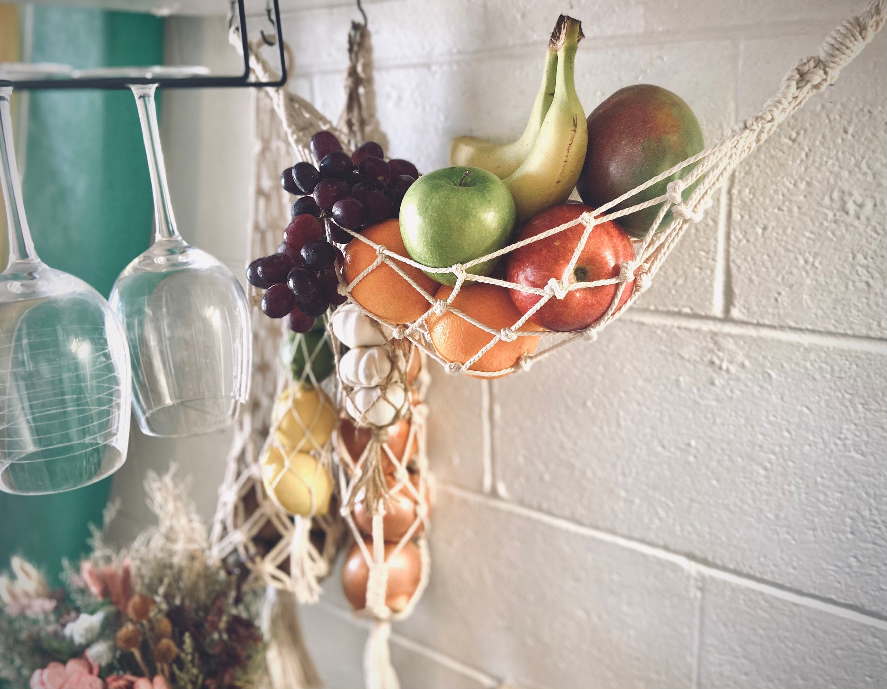 Macrame hammock for under shelf or cabinet storage. This hammock will help you store your fruits, ve...