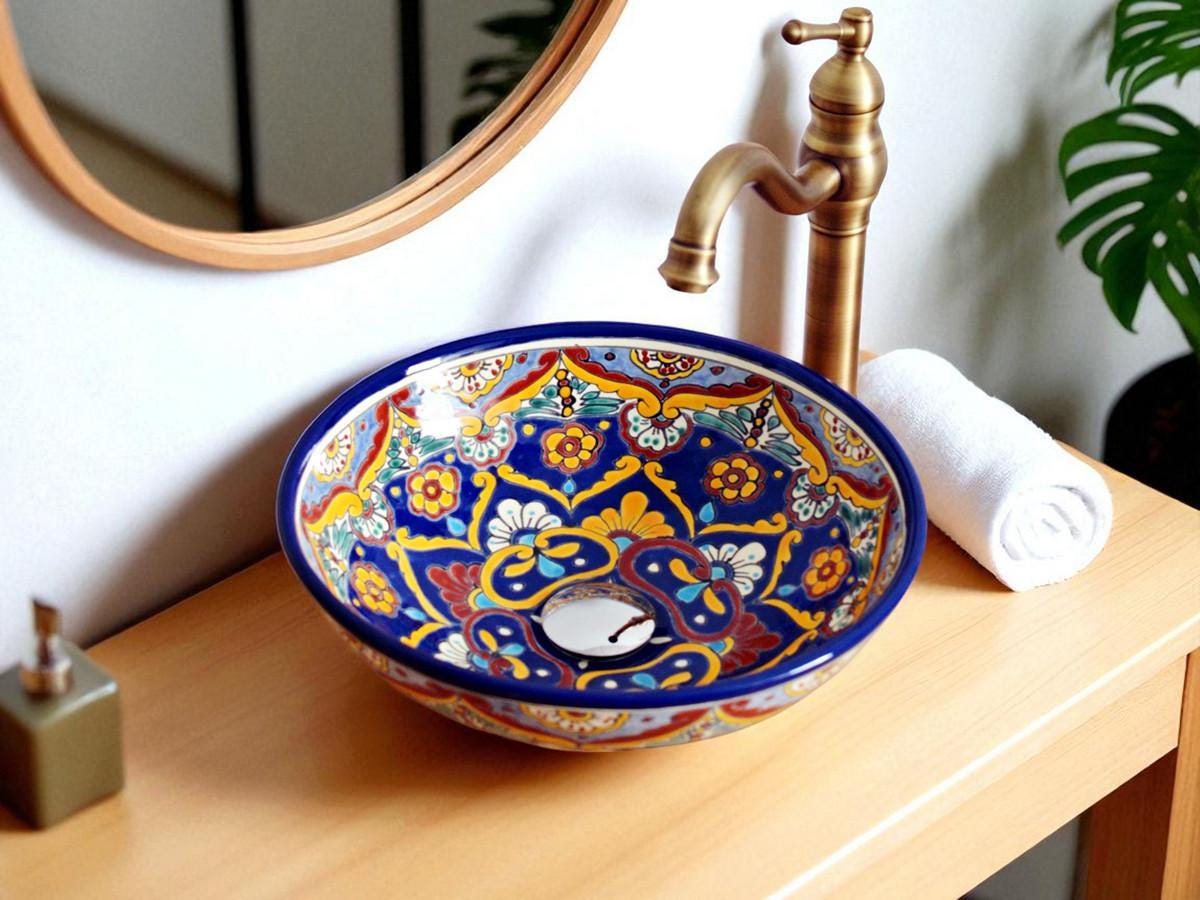ACAPULCO - Small mexican handpainted washbasin round sink, talavera...