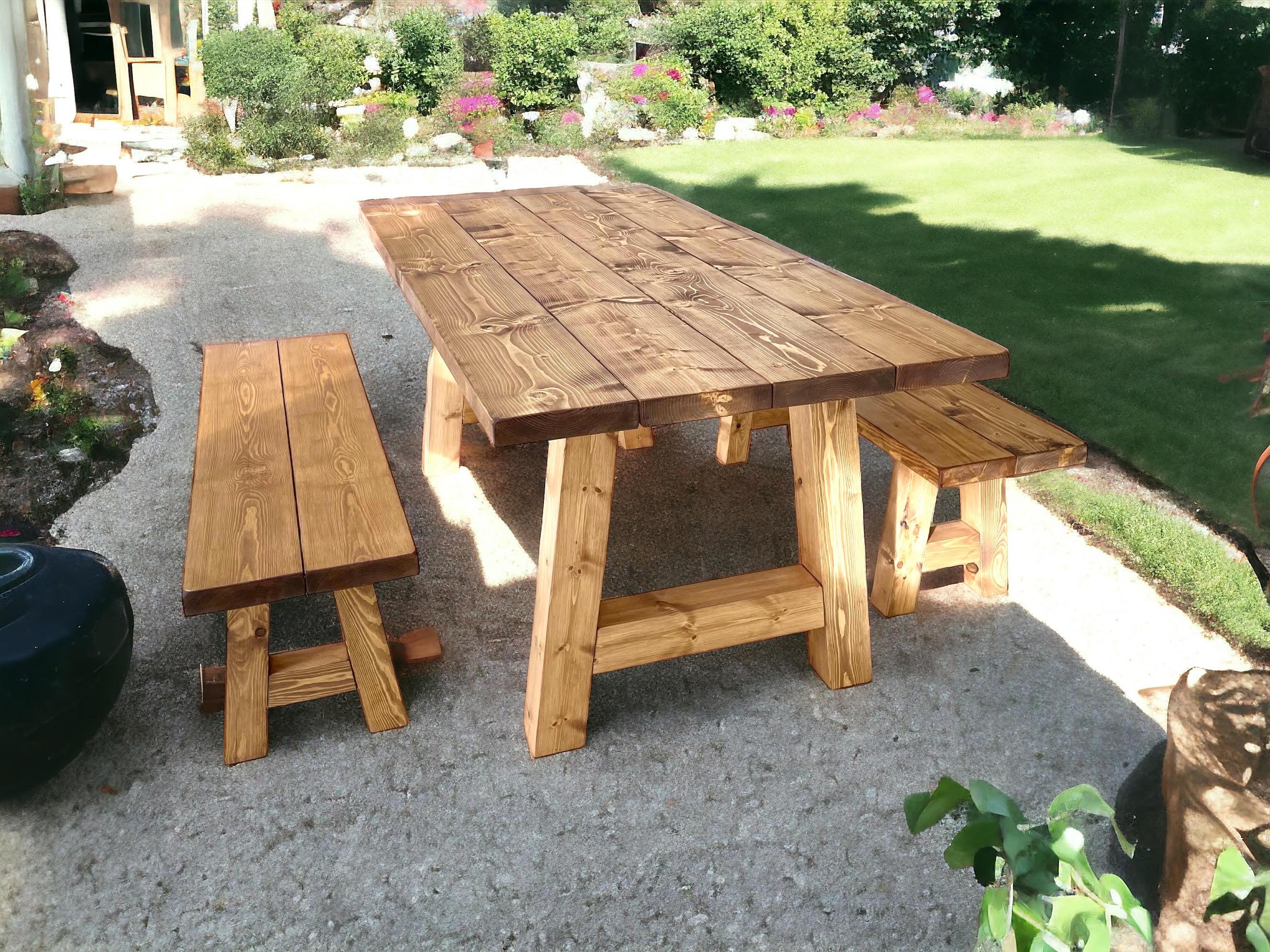 Garden Outdoor Table And Bench Set On Heavy Duty Solid Wood Chunky ...
