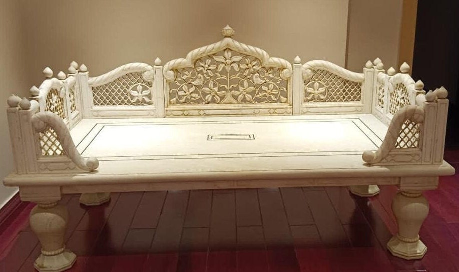 Outdoor Carving Mughal Style Daybed, Bohemian Marble Furniture, Garden Bench, Vintage Indian Daybed,...