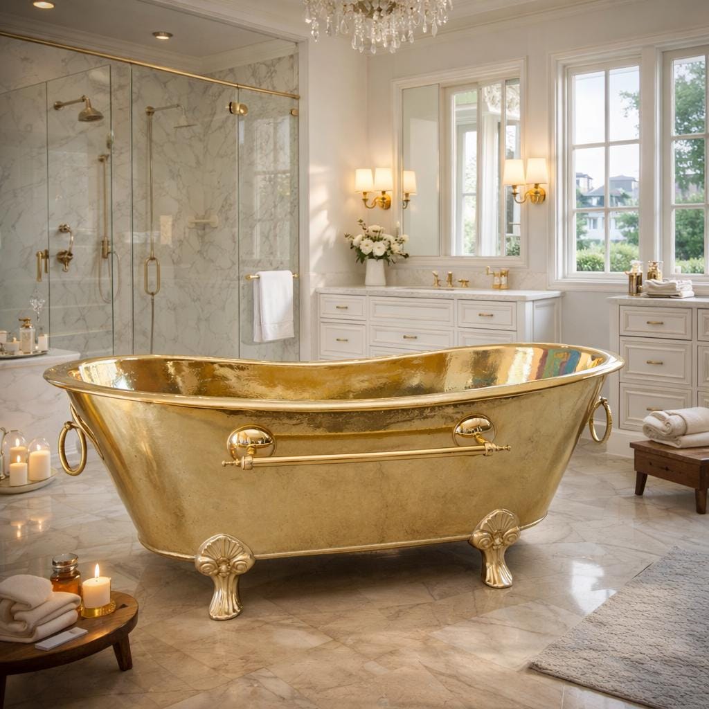 "Discover the epitome of luxury with our Handmade Brass Bathtub, an exceptional piece that seam...
