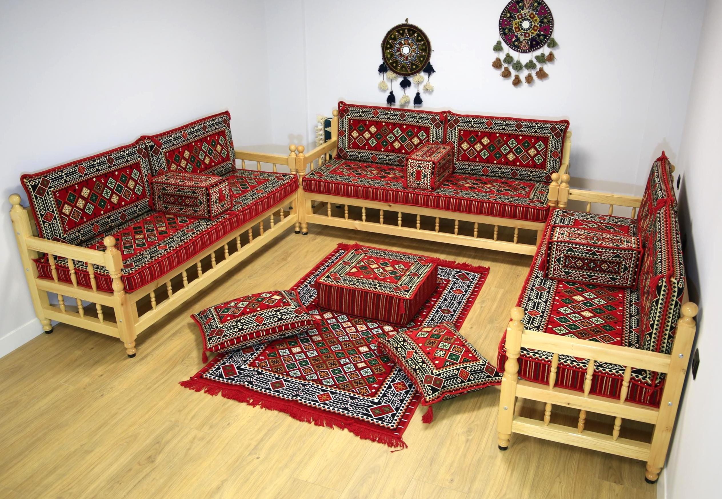 Pine Tree Wooden Couch Set, Red Kilim Bench, Ottoman Furniture Sofa...