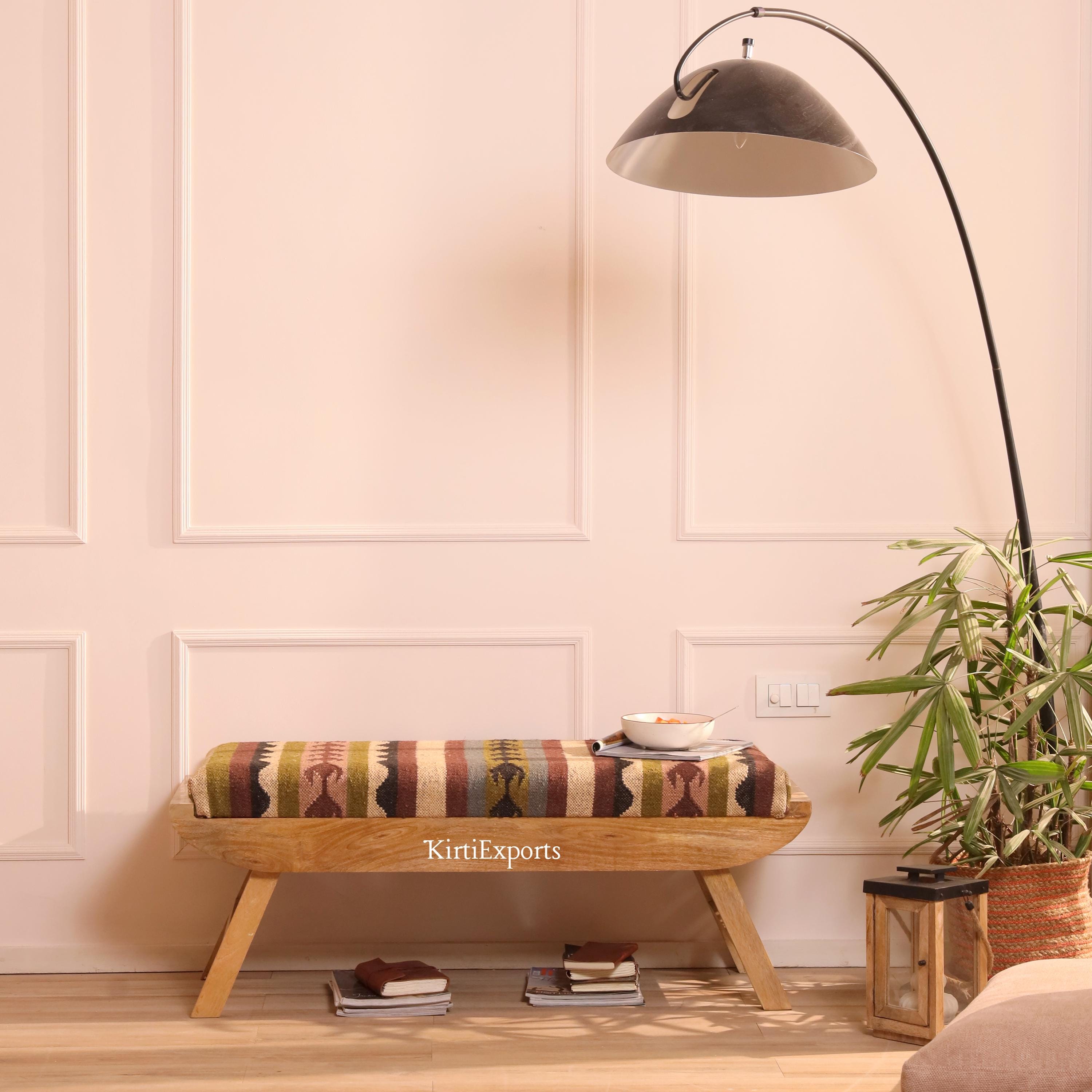 Handmade Kilim Wool Jute Rug Bench - Bohemian Ottoman, Wooden Bench