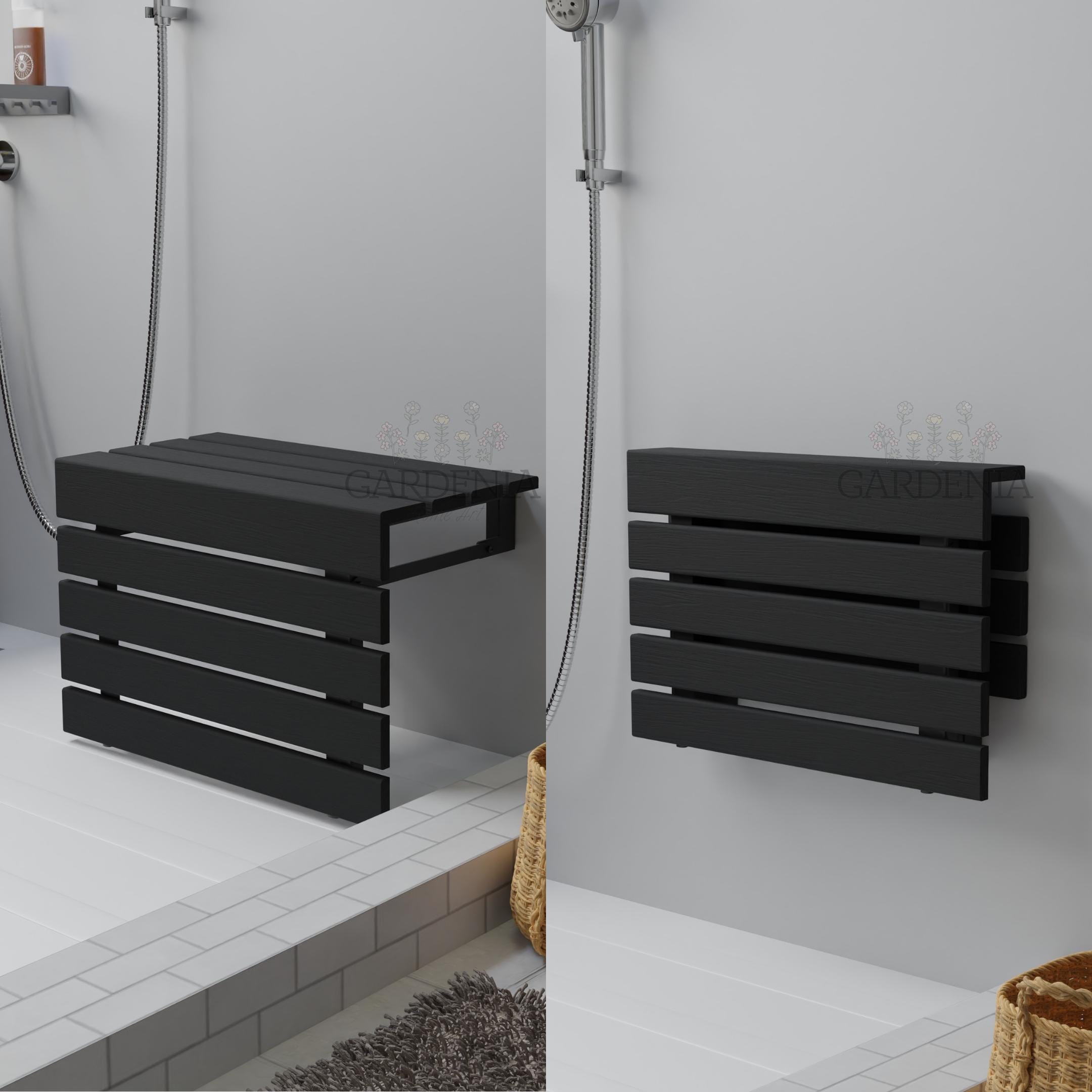 20''-50cm Large Teak Wood Wall-Mounted Folding Black Shower Seat, H...