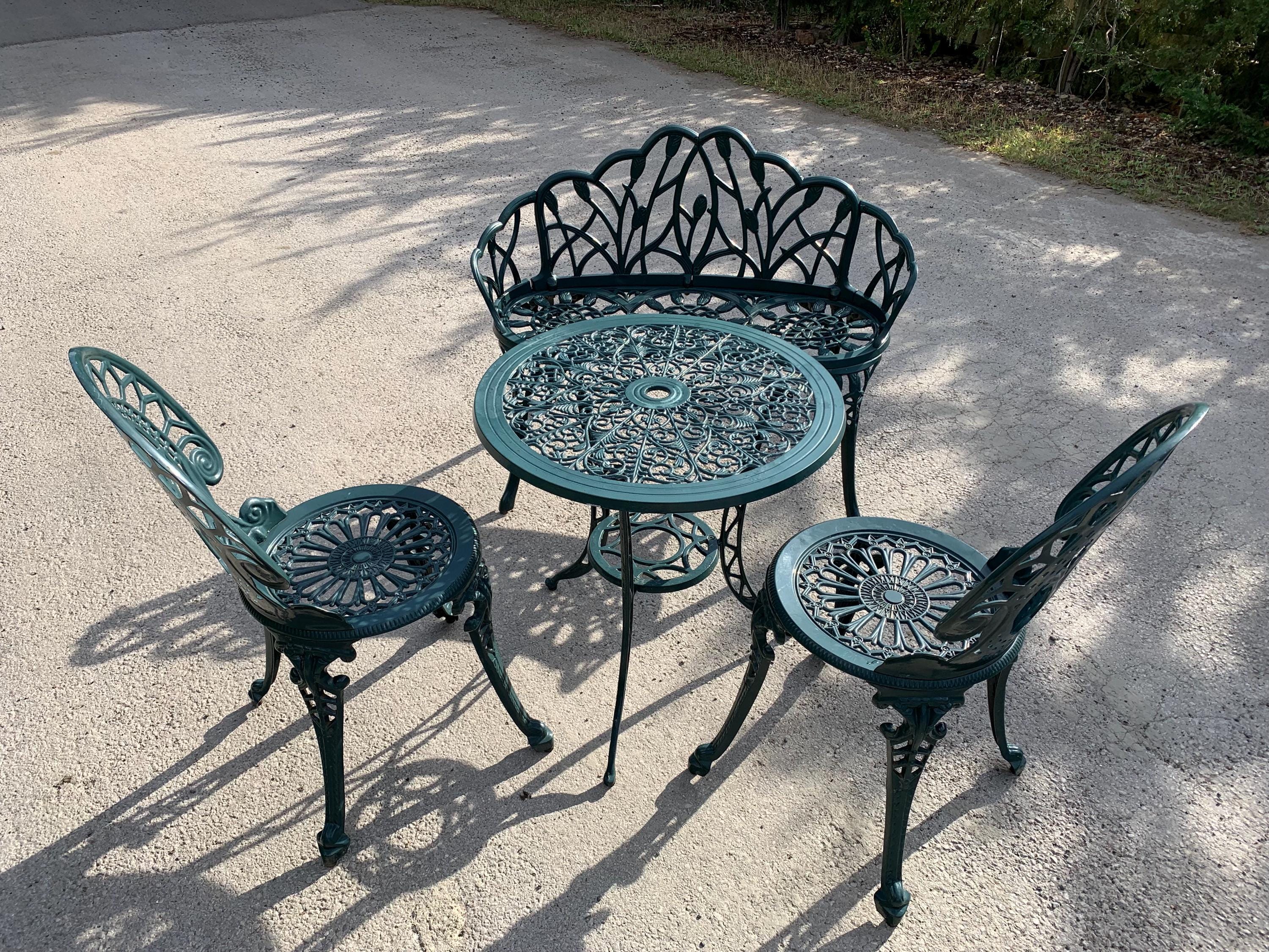 Vintage Style Ornate Balcony Table, 2 Chairs and Small BencMetal Bi...