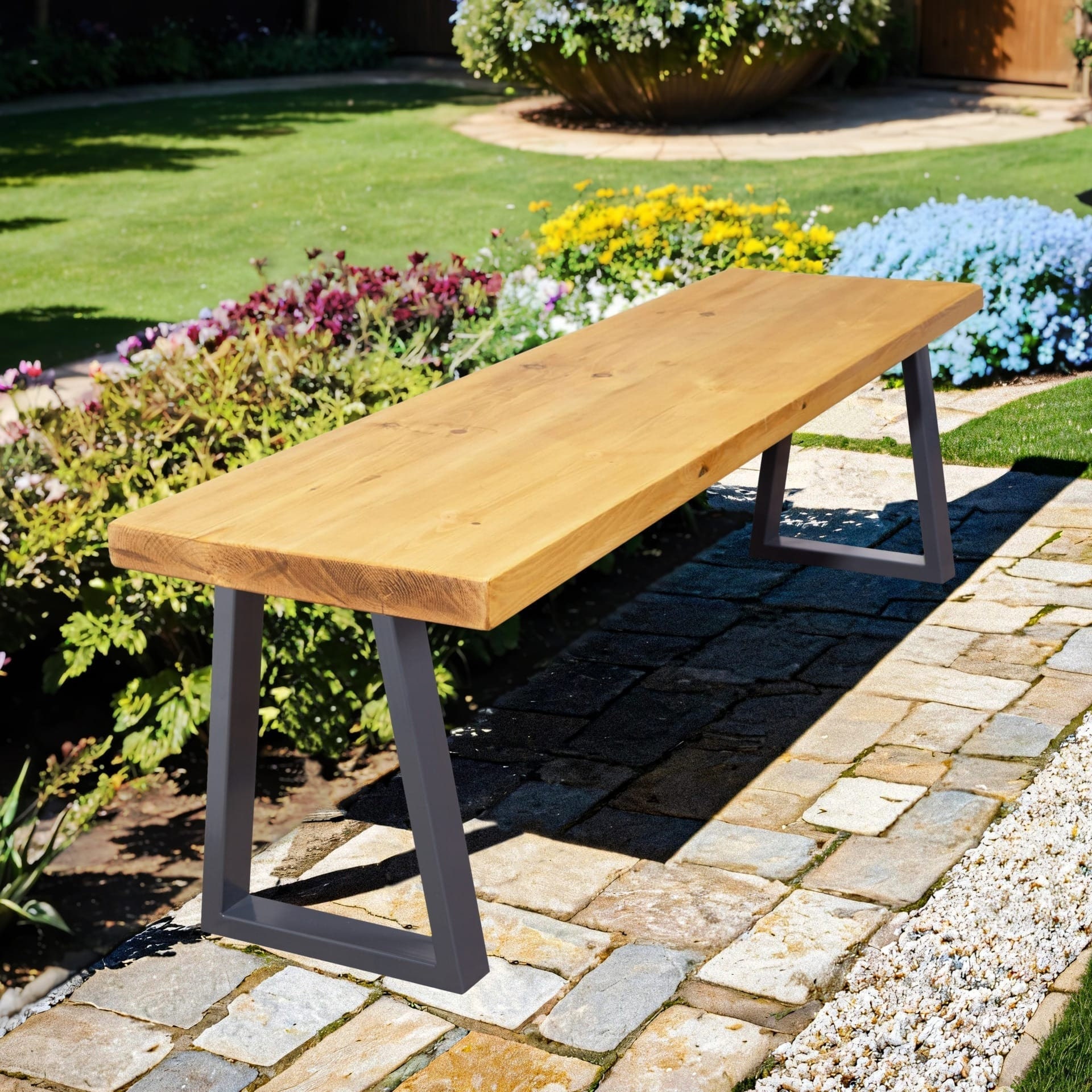 Rustic Garden Bench with Trapezium Legs | Industrial Reclaimed Timb...
